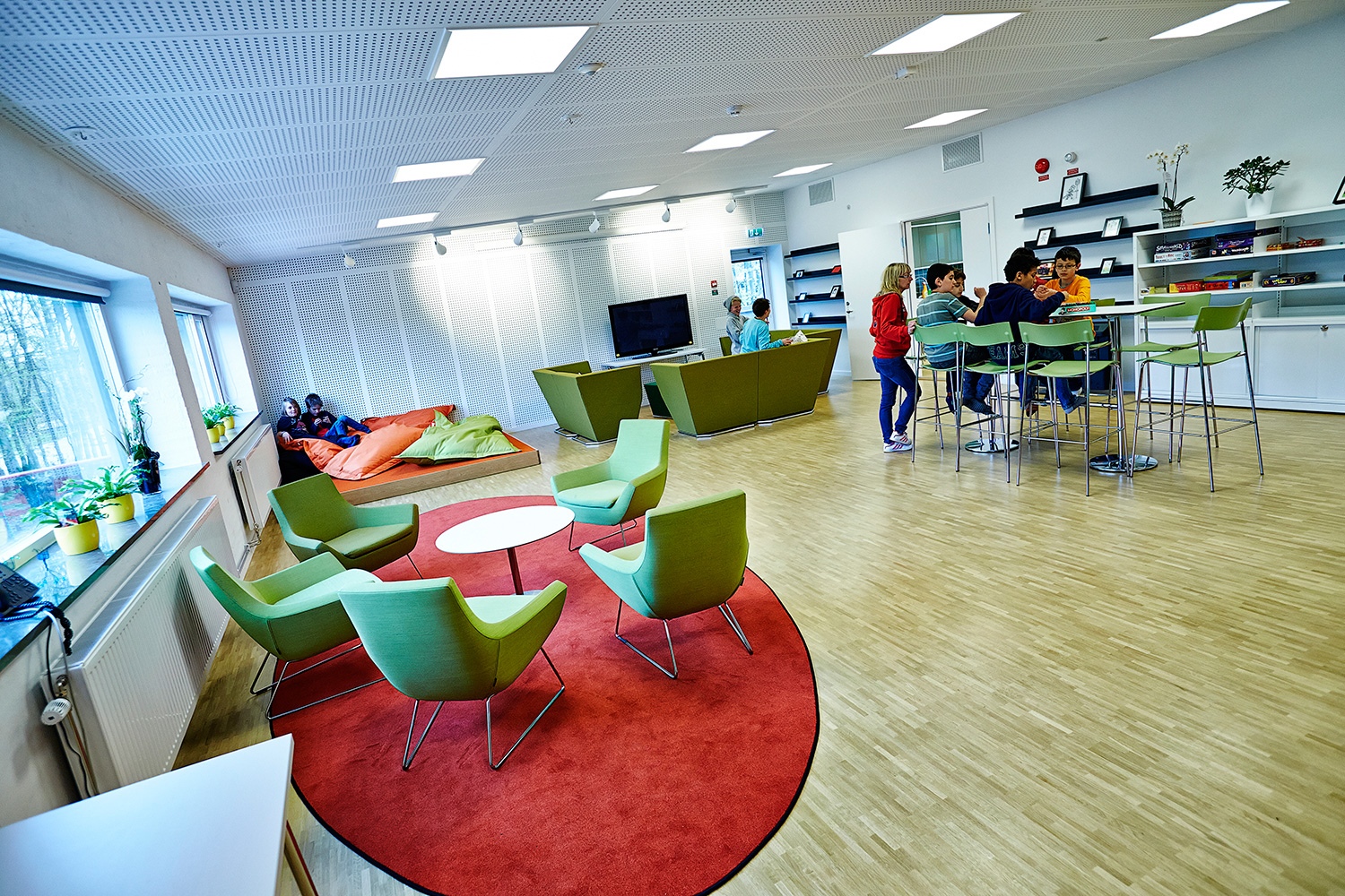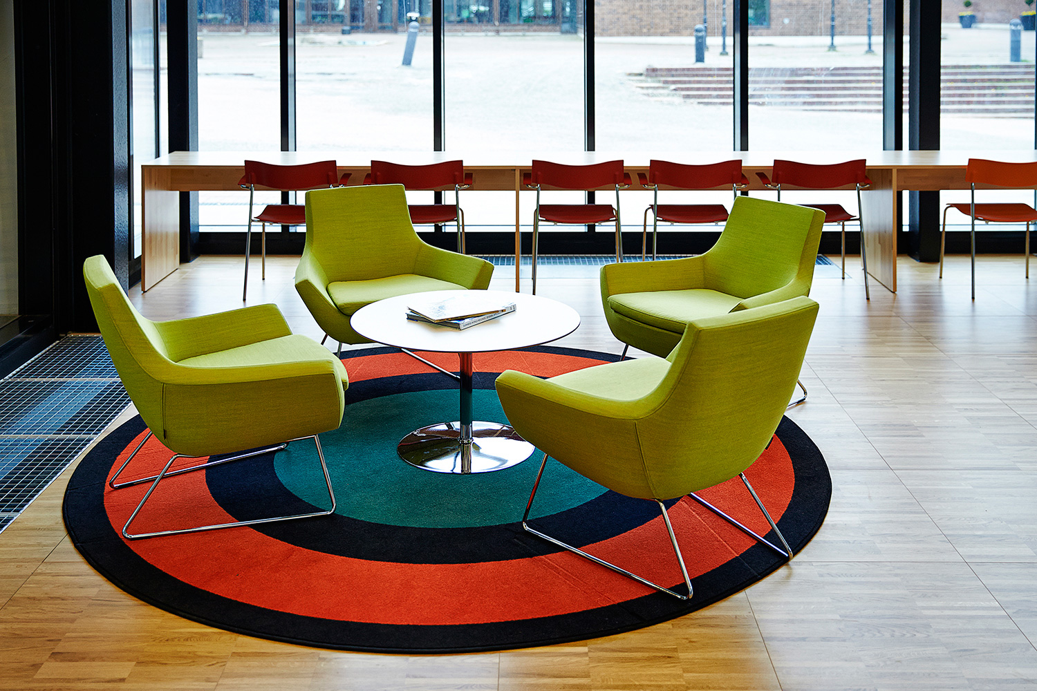 “Meeting Point Klostergården” has now been open to the public for a month, and Karin can proudly confirm that her vision has become a reality. The different parts of the building are effectively united by a common interior theme where the colour scheme, choice of materials and furnishings tie everything together in a subtle and tasteful way. The new building with its enormous windows facing the local square has almost magically transformed the previously intimidating environment into a living room for the neighbourhood, where people feel comfortable and at home. It is particularly noticeable that new users have been attracted to use the library and Karin is delighted that parents with toddlers are much more frequent guests at the library.