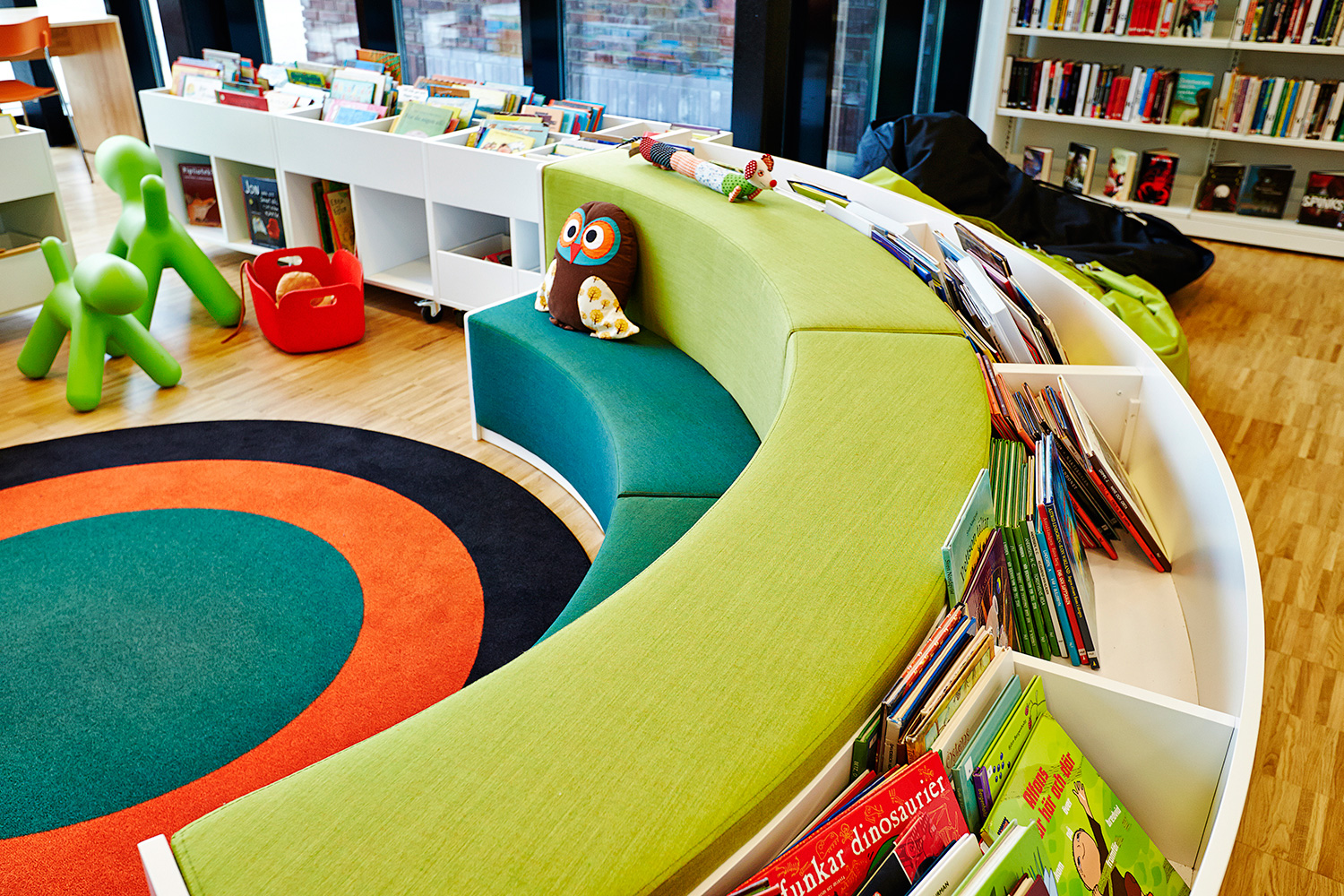 “When it comes to the interior design, I am particularly happy with the long seat benches along the window wall facing the square, as they make the interior and exterior merge together really well. The furniture then draws you inwards with the tallest furniture towards the back of the room – really striking! Central to the room is an amazing curved shelving unit. Despite being quite large, it is unobtrusive and creates corners and niches where the children spontaneously discover new books.”