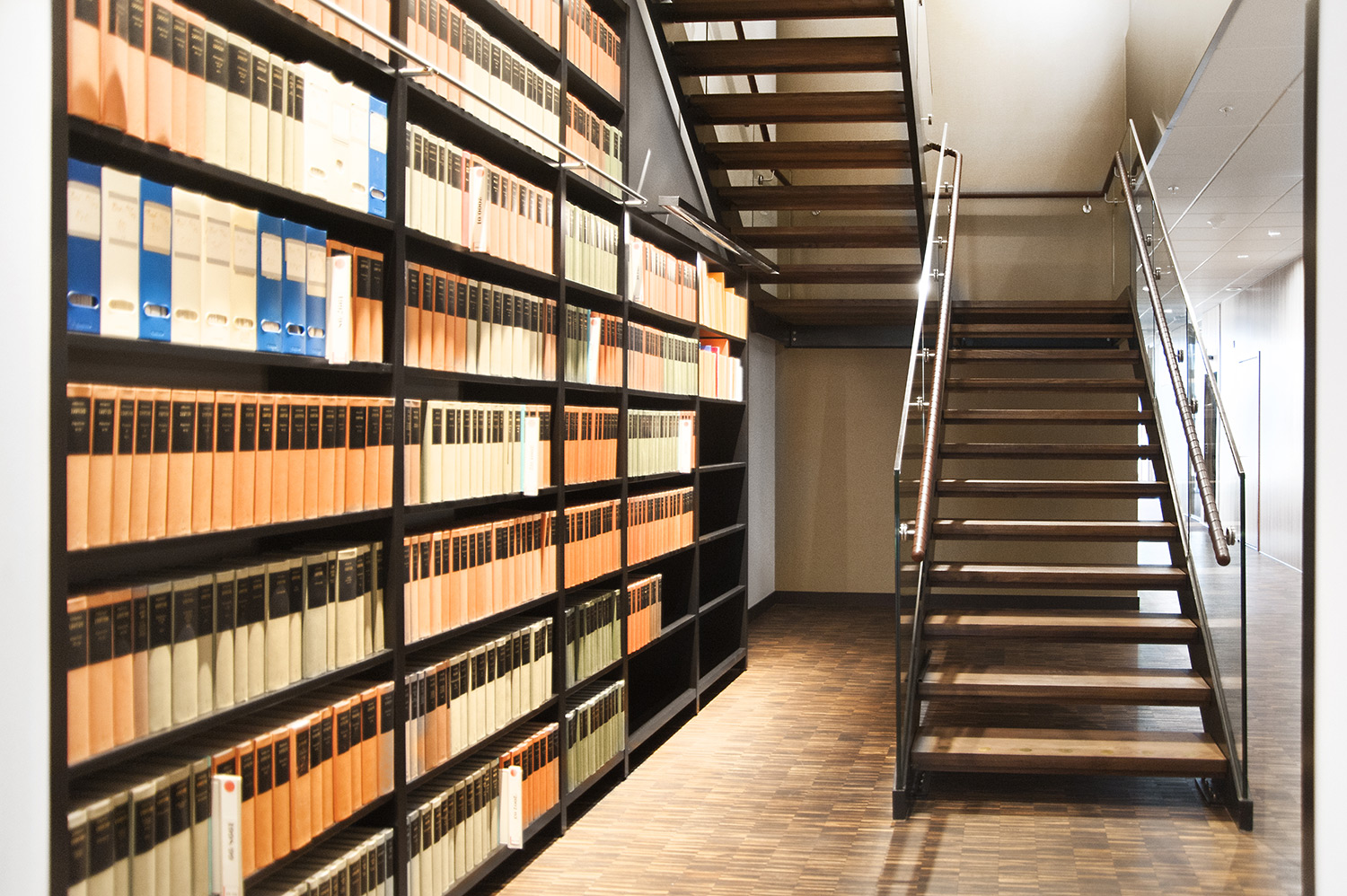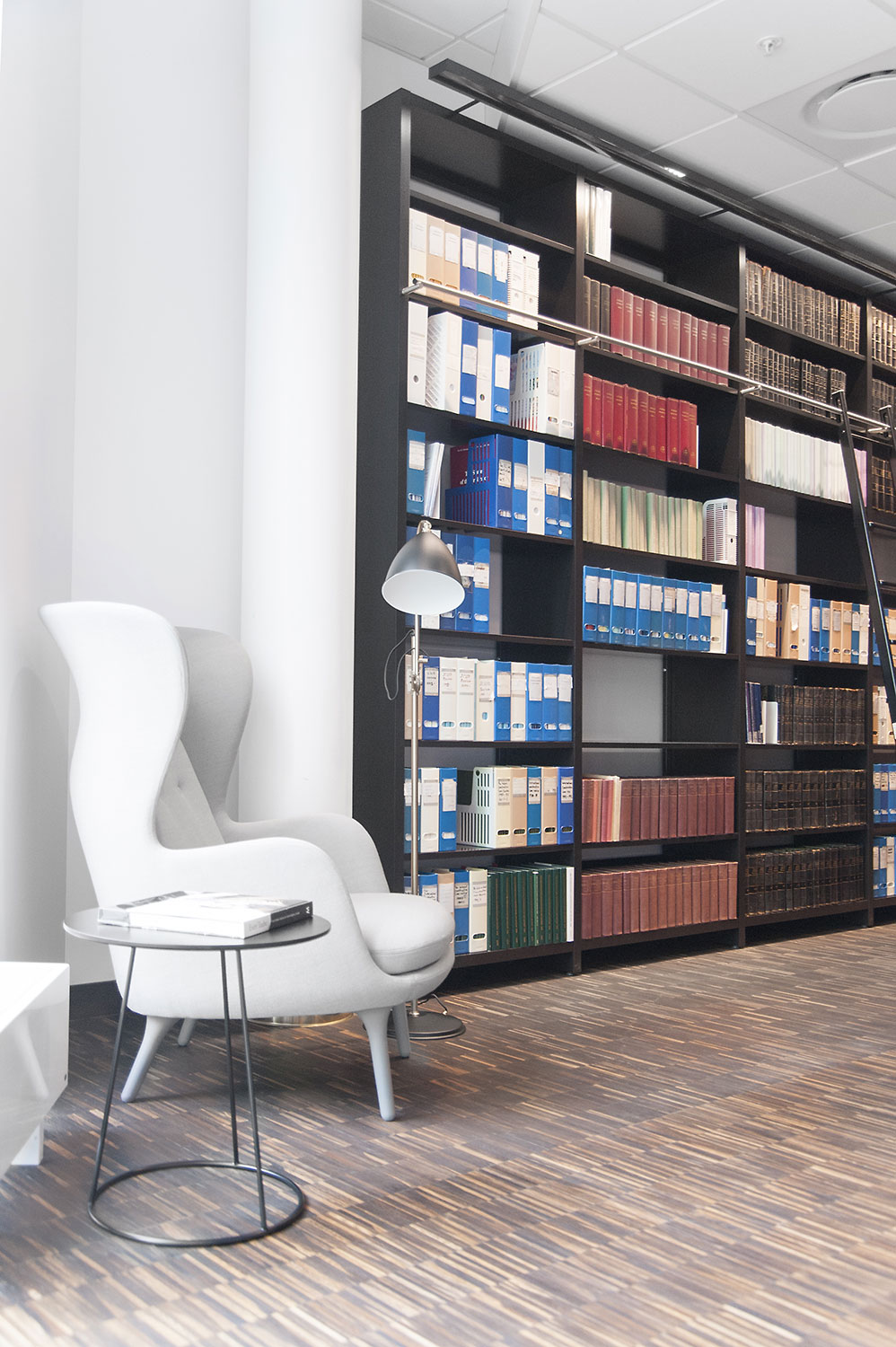 The high, single-sided Frontline shelving system that extends from floor to ceiling is functioning well and has been supplemented with a ladder in order to reach even the top shelves. Farther into the room a slightly lower, single-sided version with end panels in black stained oak has been chosen.