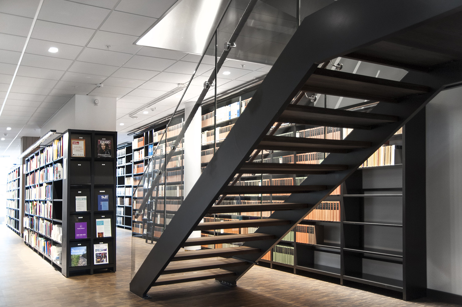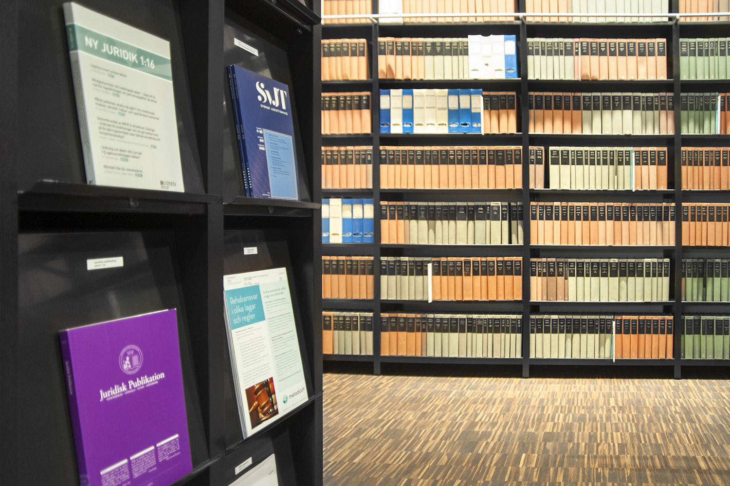 In this office, located in newly built premises in Malmö, front display is not crucial to find book titles; it is enough to see the book spines to enjoy the library's collection.