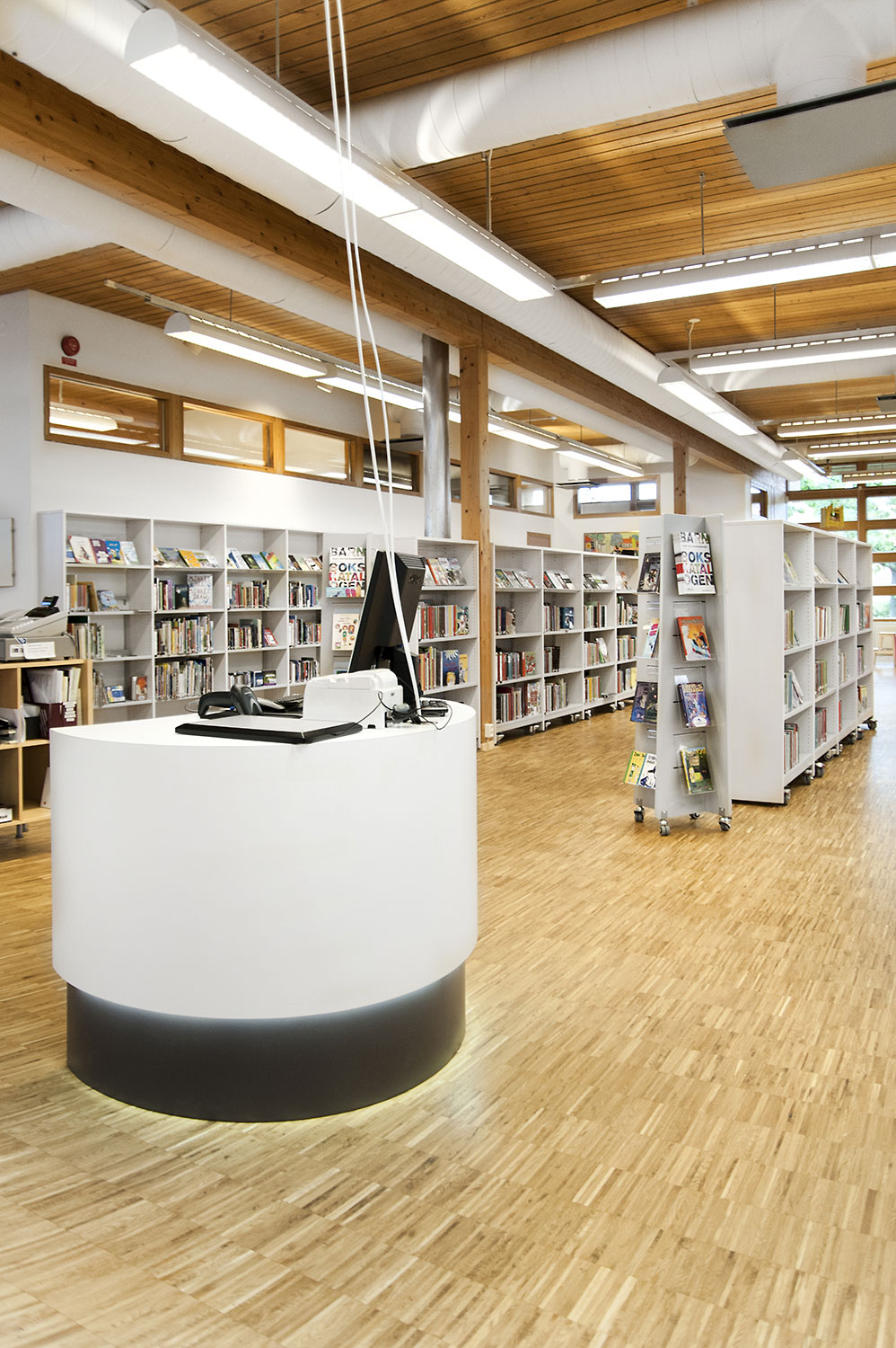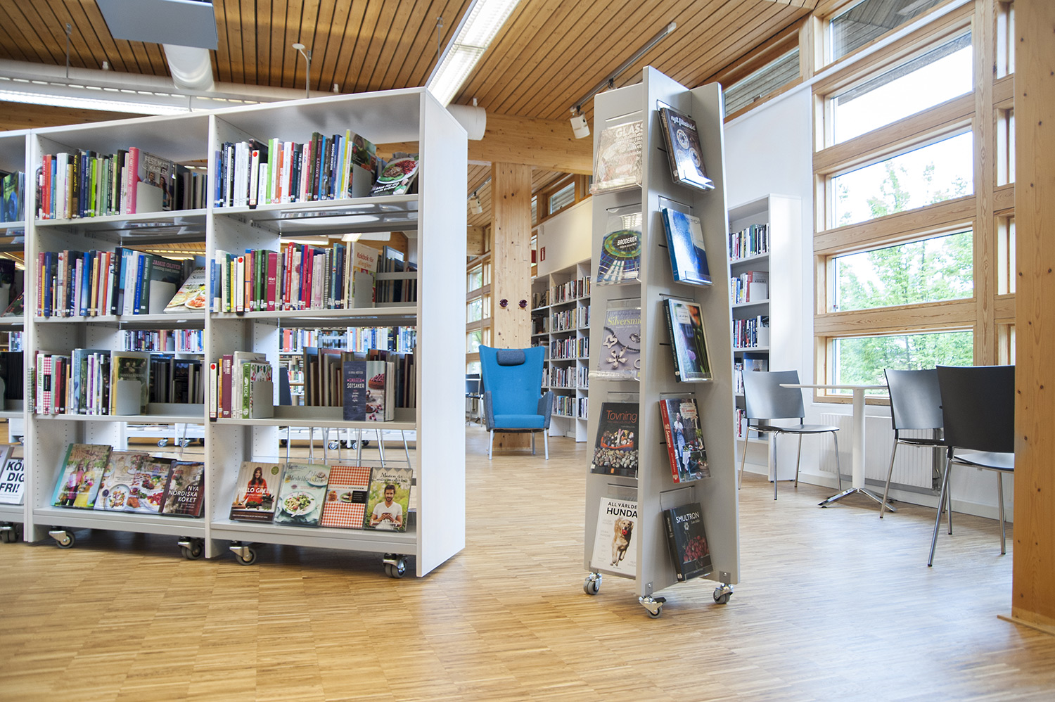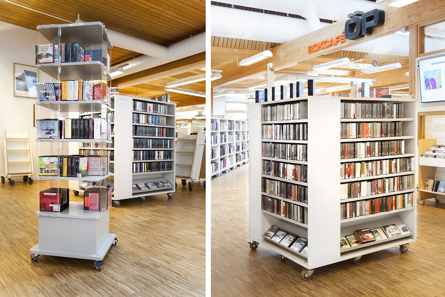 All Frontline shelving systems are mounted with castors for flexibility and can be moved for lectures and cultural events. The Ordrup magazine display cabinet has a perfect spot in the library, its position making its content easily accessible, while Info pods with integrated LED light are placed near the entrance for information and help from the librarians. Book Tower on castors are used for freestanding display of audiobooks.