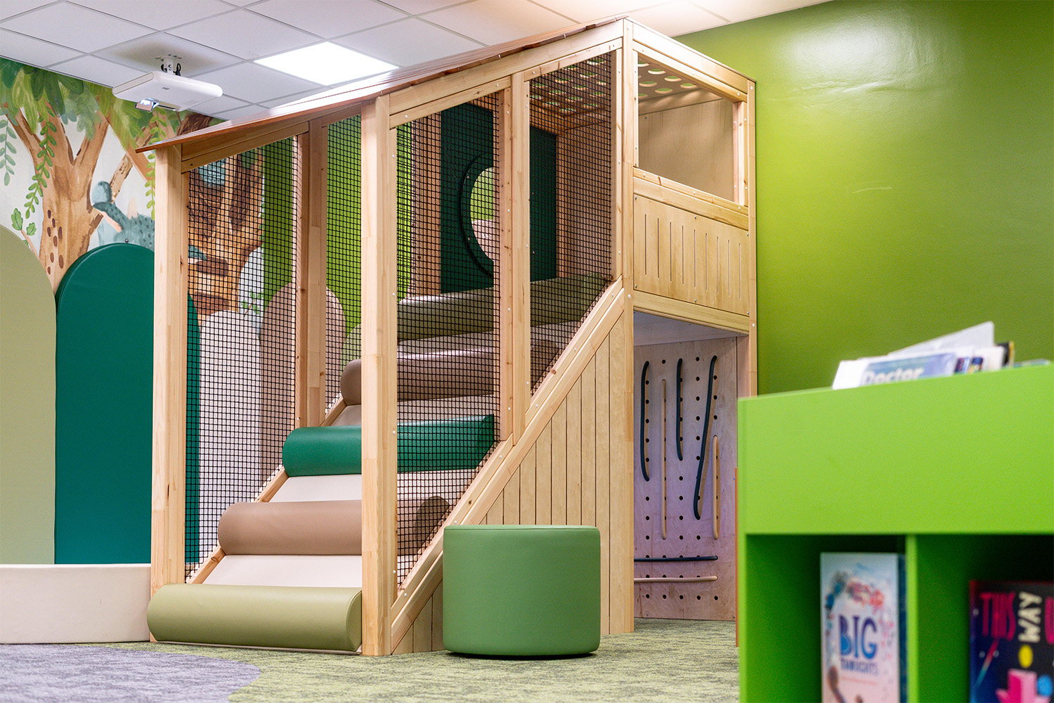This engaging environment features a range of interactive elements designed to stimulate curiosity and learning, including fibre optic strands for tactile interaction and projected games for visual engagement. A playful shopfront encourages children of all ages to develop early mathematical and communication skills through imaginative play. From climbing through the treehouse and peering through its windows, to boarding the bespoke animal rescue bus or building in the repair shop, the forest-themed setting offers something for everyone.
