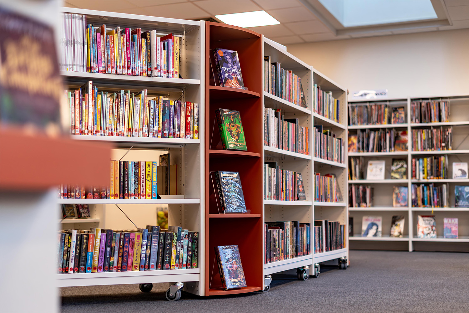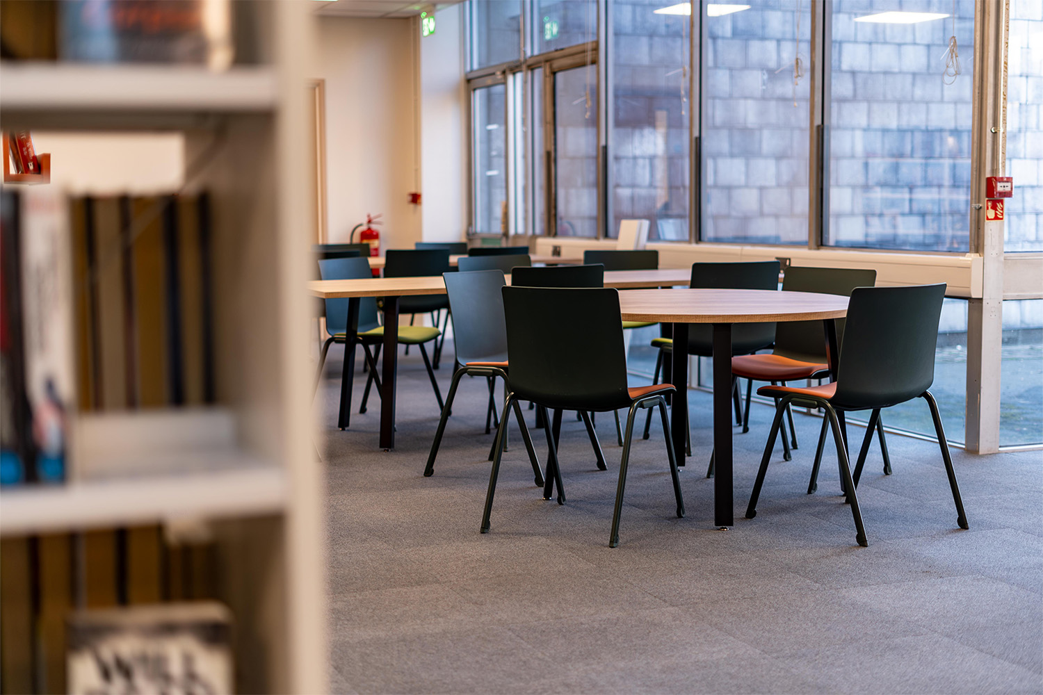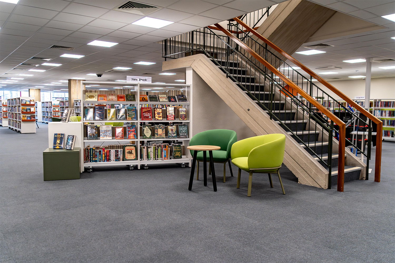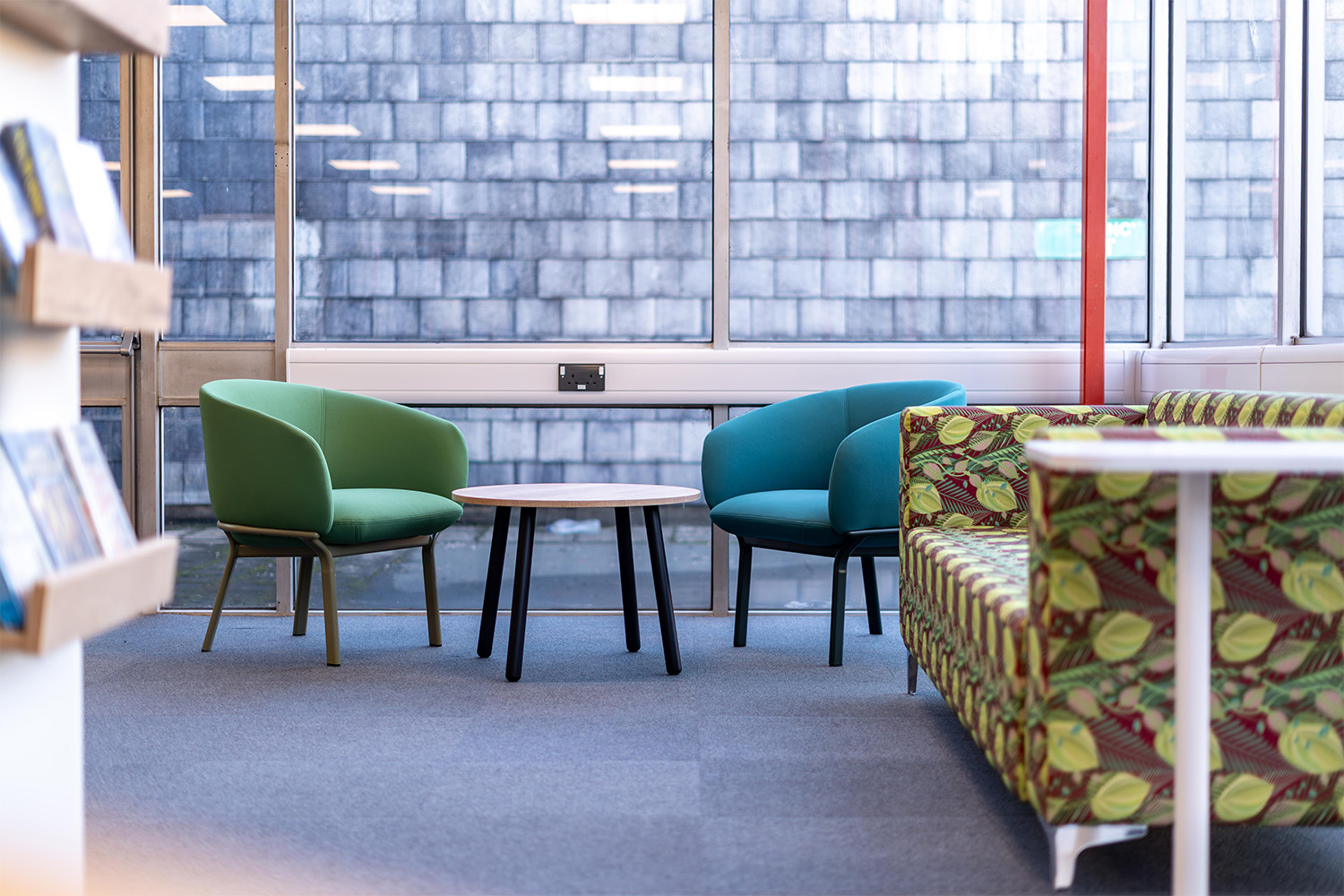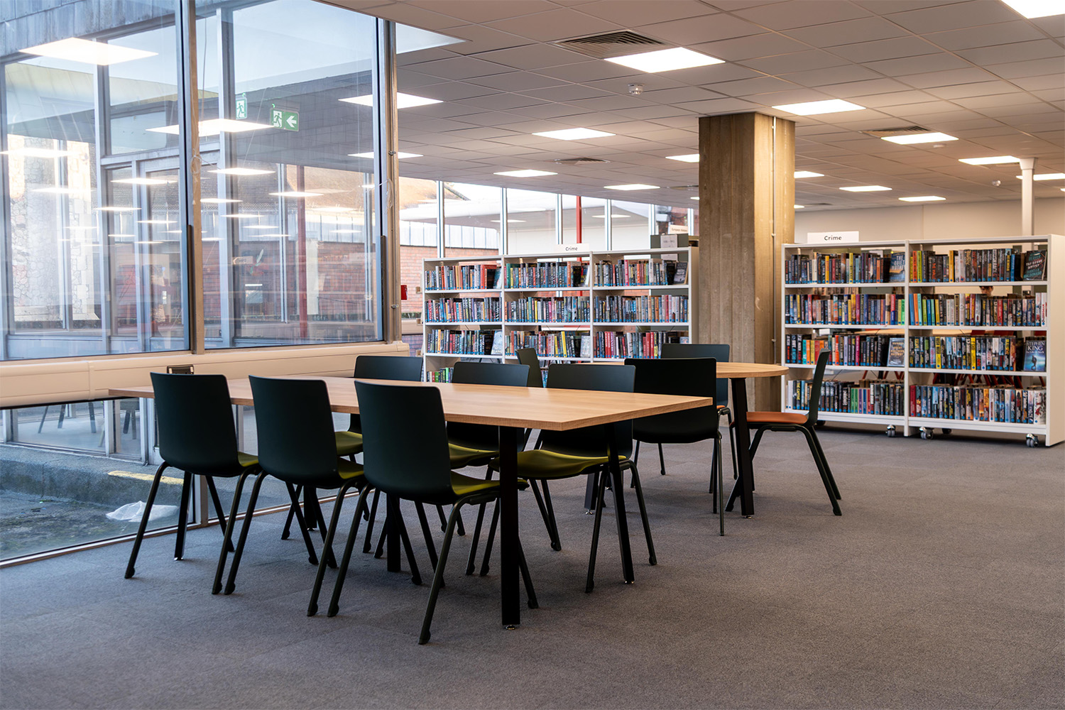 Repurposing furniture, such as some of the existing shelving at Colchester, has become a forward-thinking and sustainable design choice best for modernised yet socially friendly local libraries. The aim here was to reduce waste and lower renovation costs while preserving materials that still ultimately have functional shelf-life.