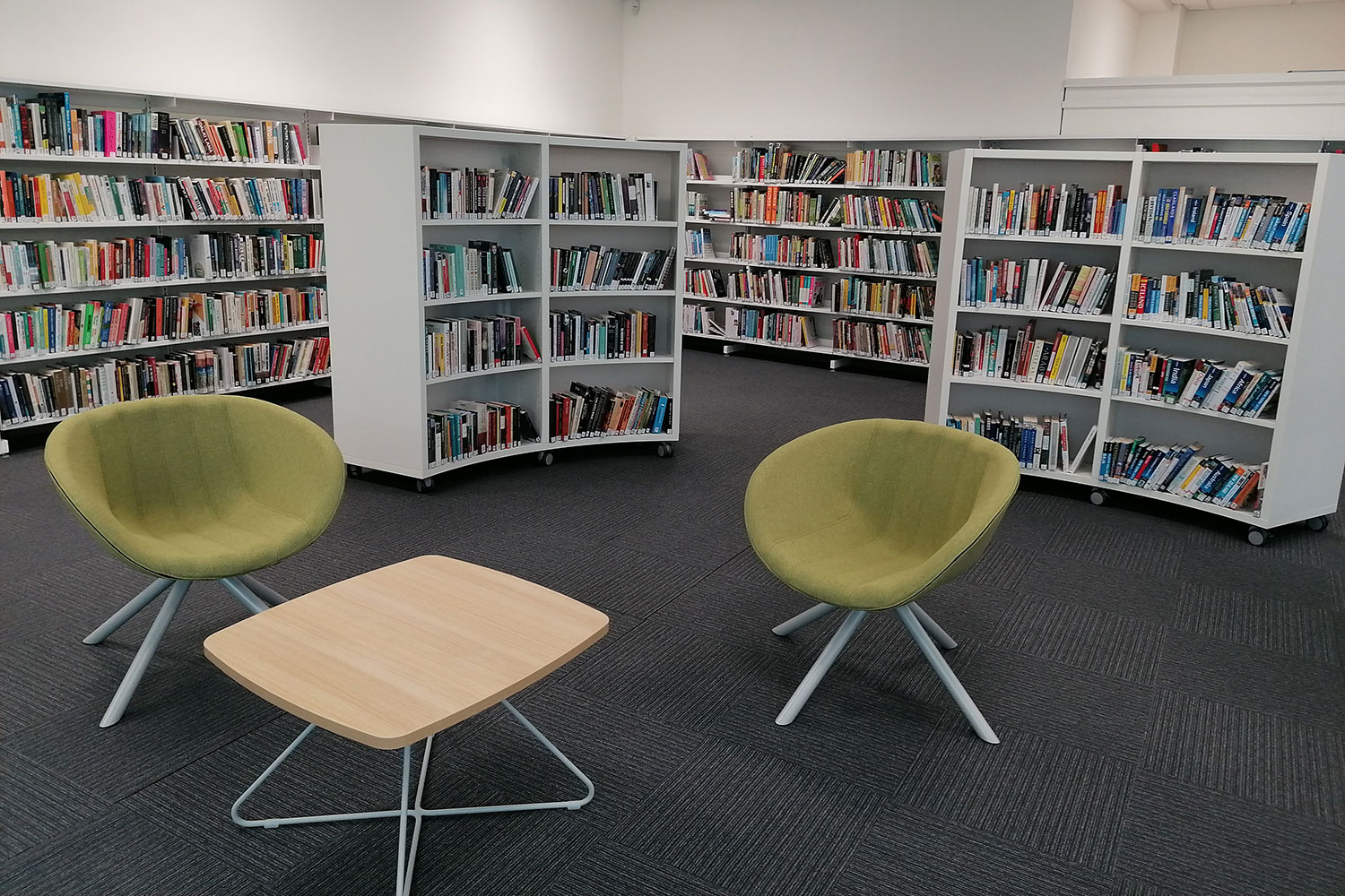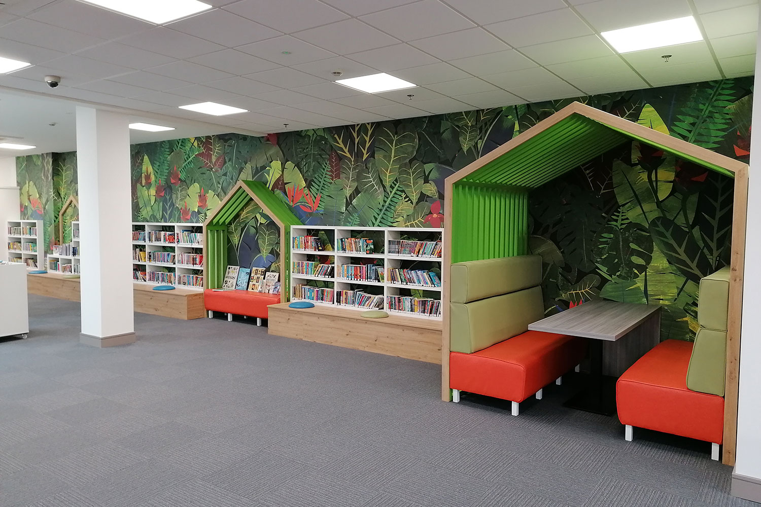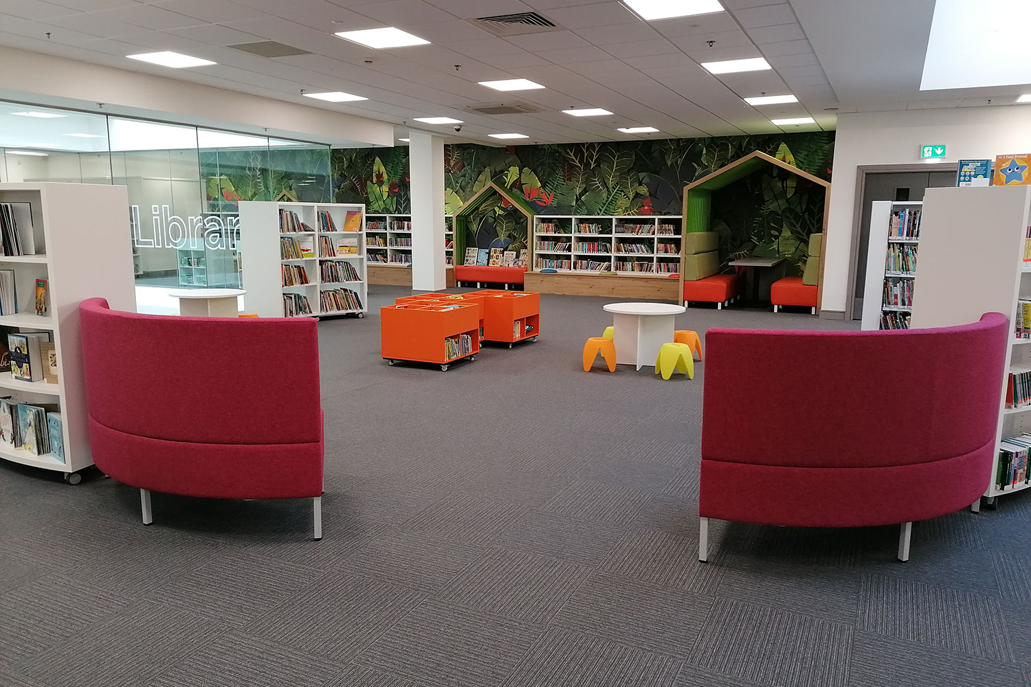 The open plan library, with a glazed panel overlooking the mall below, allowed us to use our creative flare. We installed brightly coloured wall graphics and created a house-like landscape which is striking to passers- by and busy shoppers.