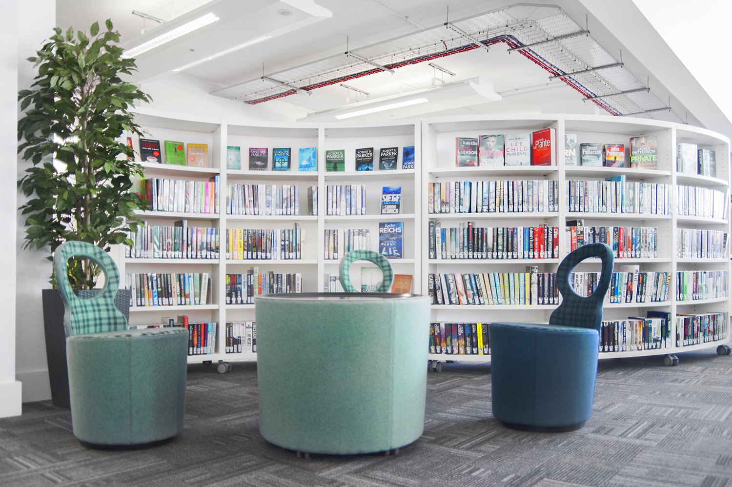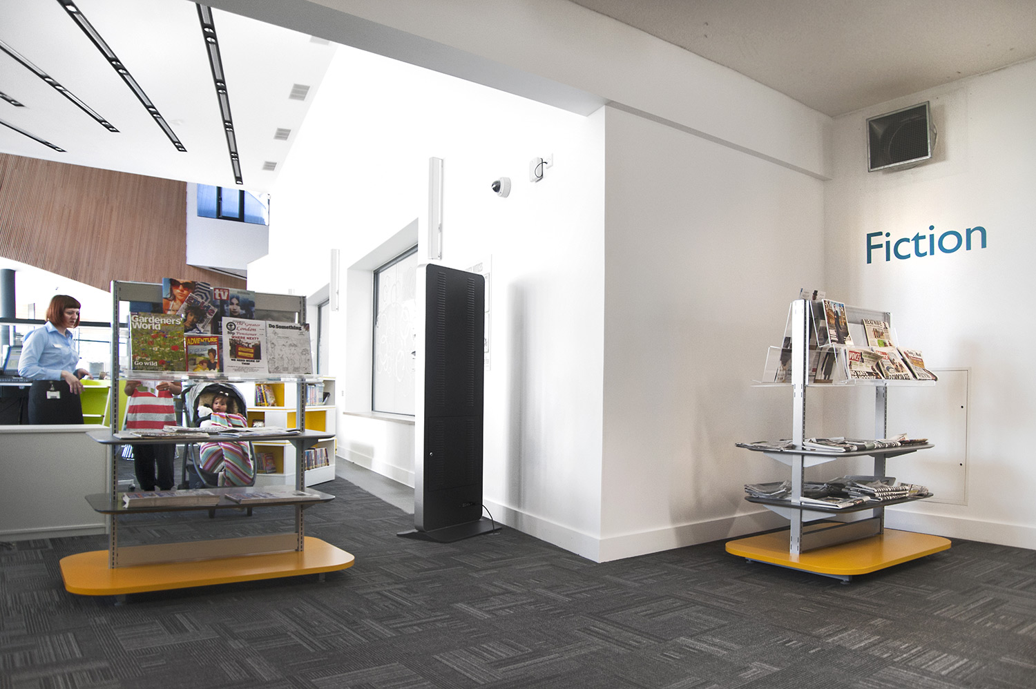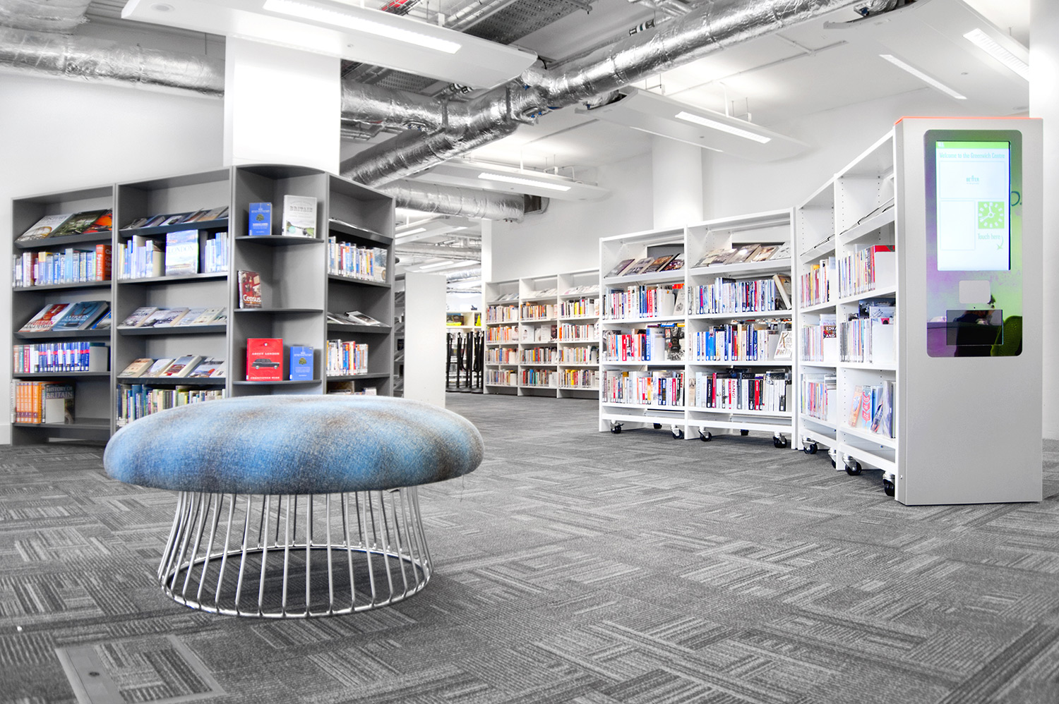 Throughout the library, digital end panels allow customers to browse for specific books and authors as well as giving access to the library’s app which highlights new books and facilities that are available for each customer.