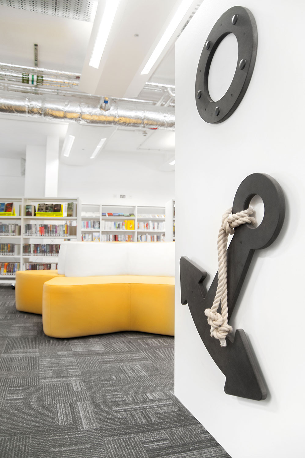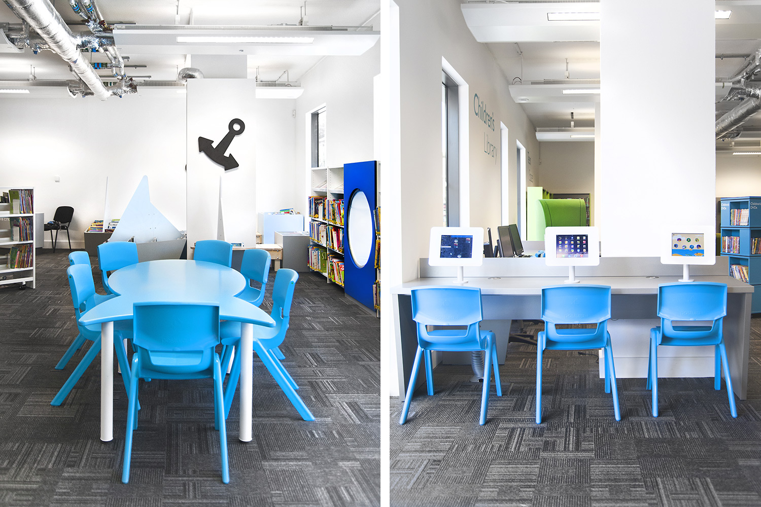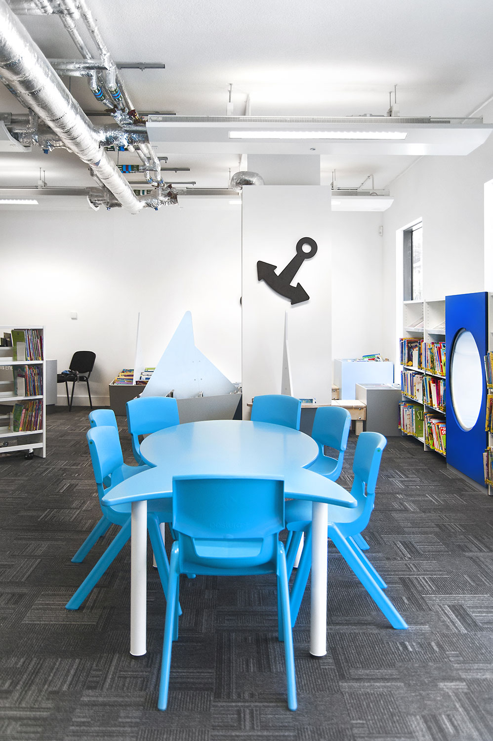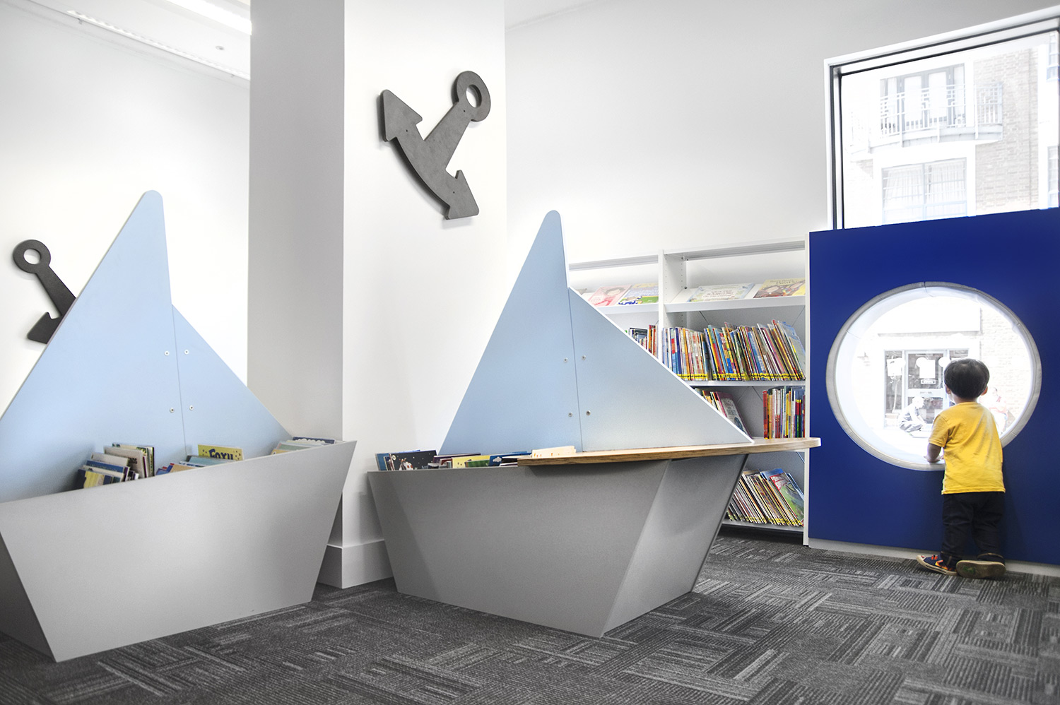 Following a maritime theme, to incorporate the rich history of Greenwich, the children’s area of the library has been fitted with boat shaped browsers and the shelving includes waves, anchors and port-holes for children to enjoy. The children’s library also has PC’s and tablets available for the younger visitors.
