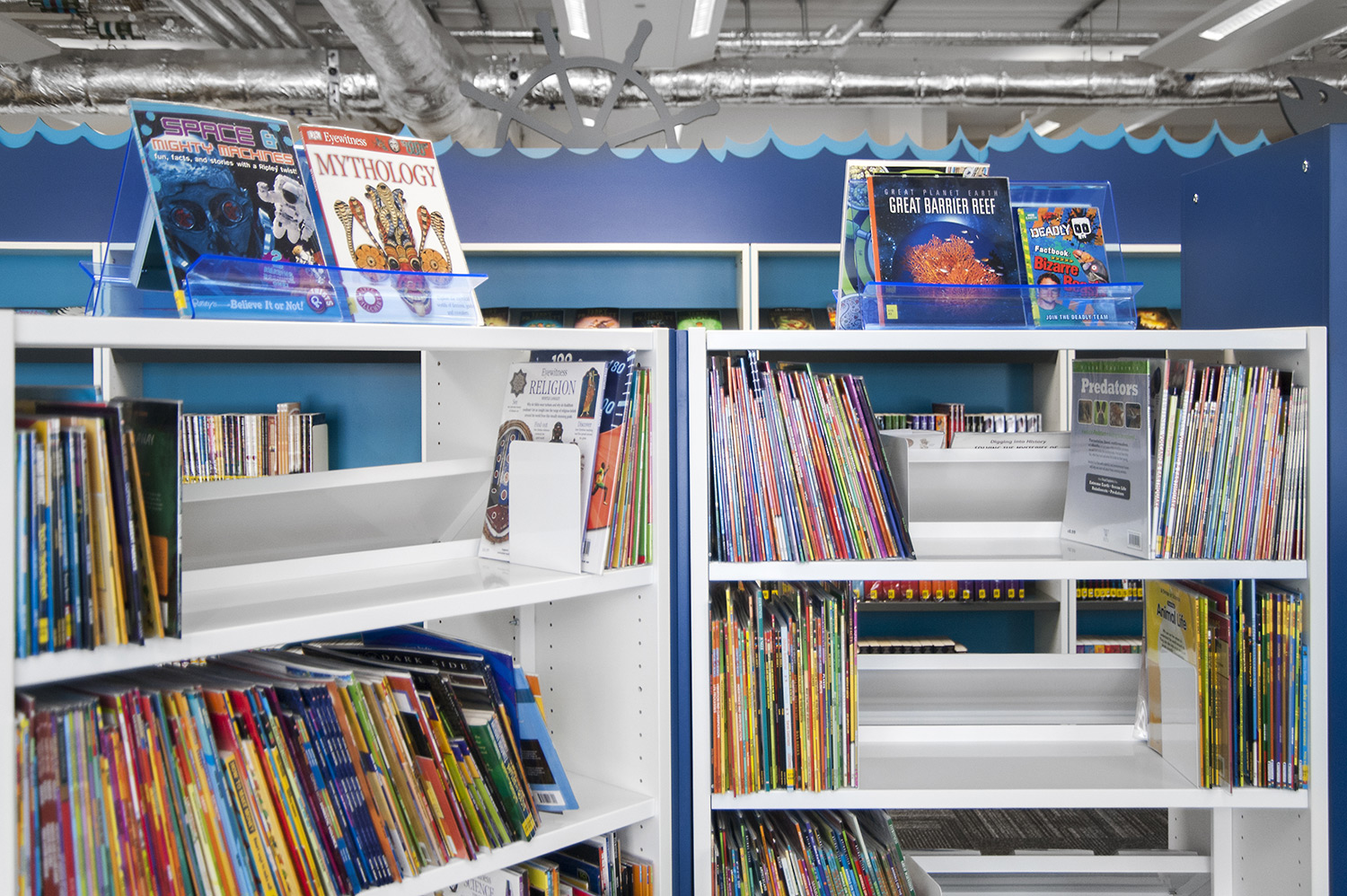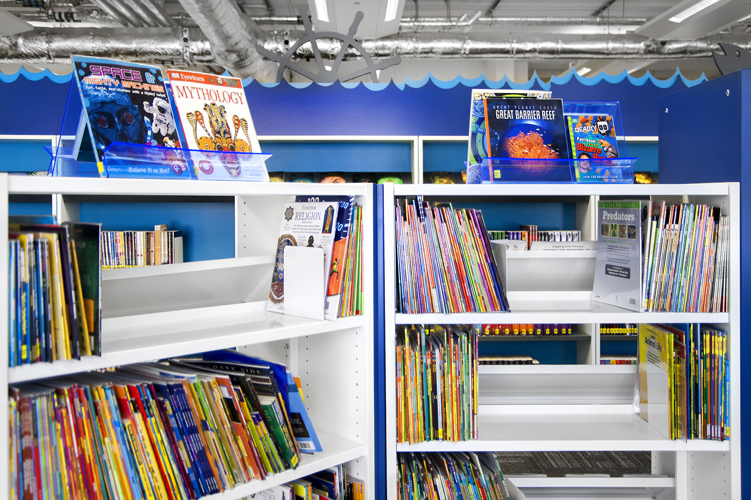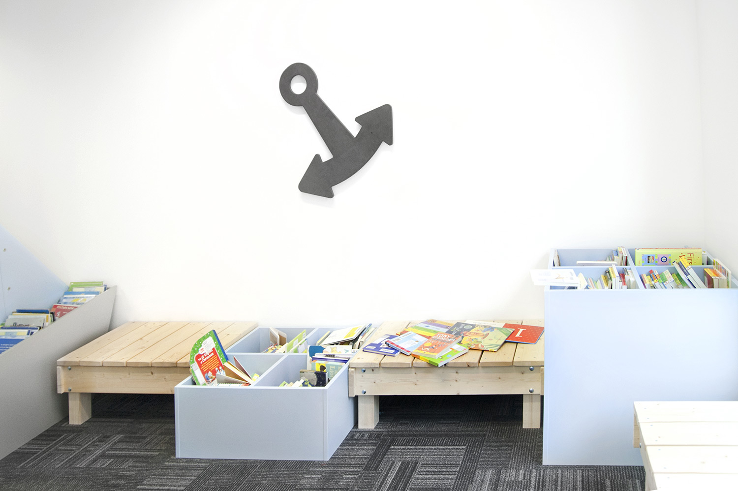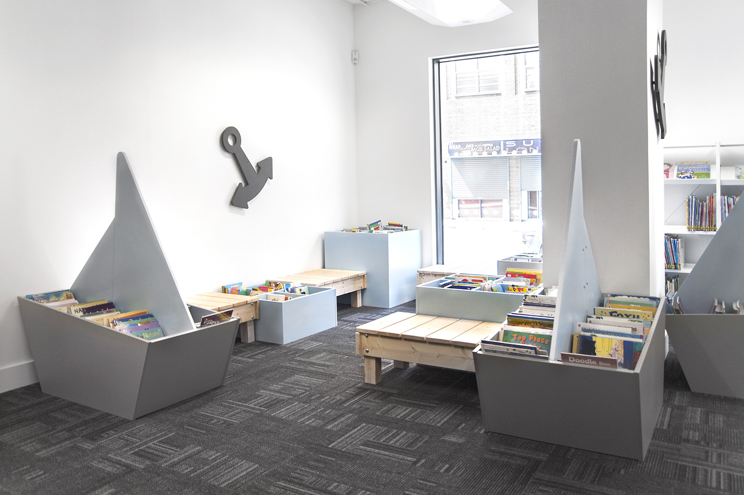 Following a maritime theme, to incorporate the rich history of Greenwich, the children’s area of the library has been fitted with boat shaped browsers and the shelving includes waves, anchors and port-holes for children to enjoy. The children’s library also has PC’s and tablets available for the younger visitors.