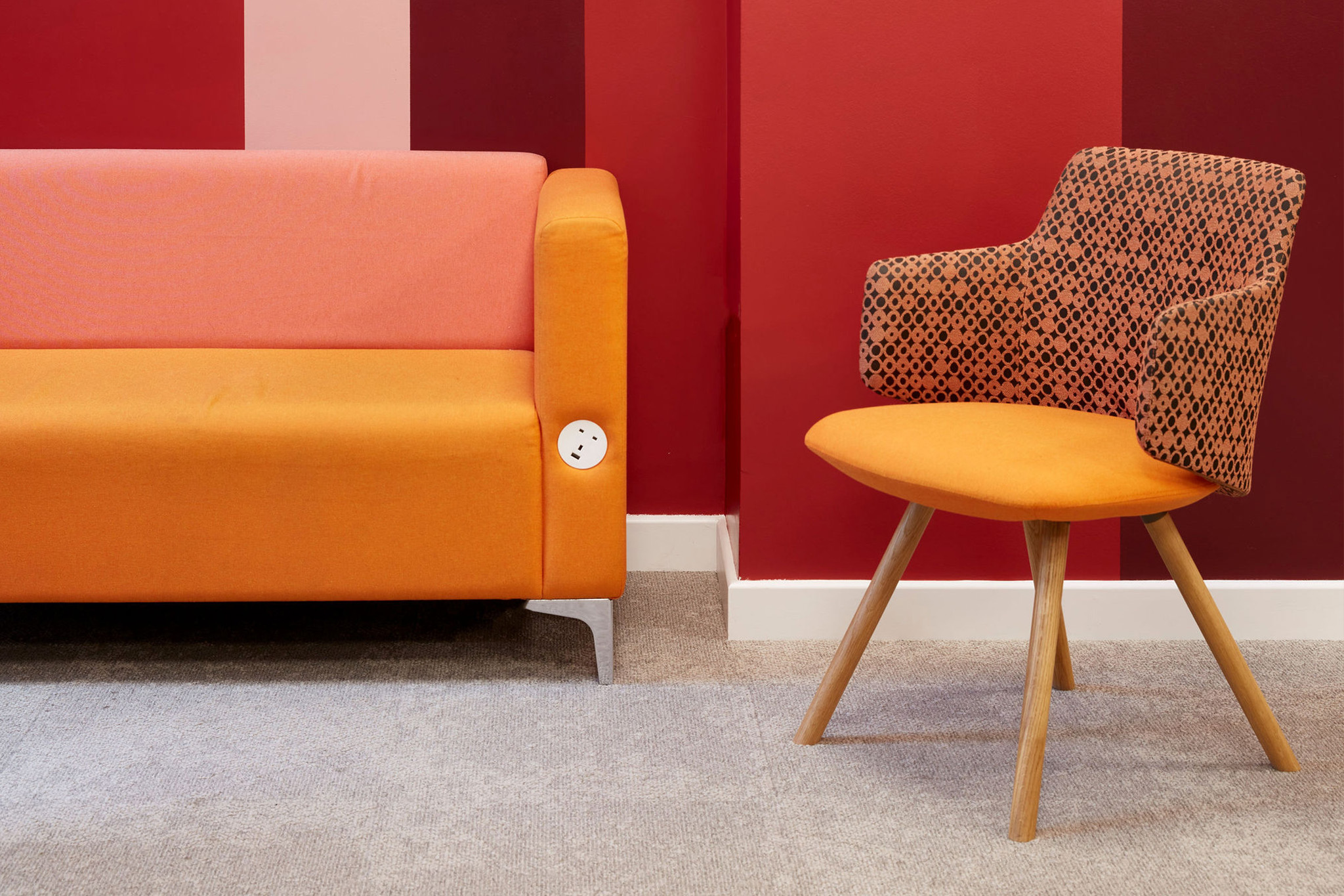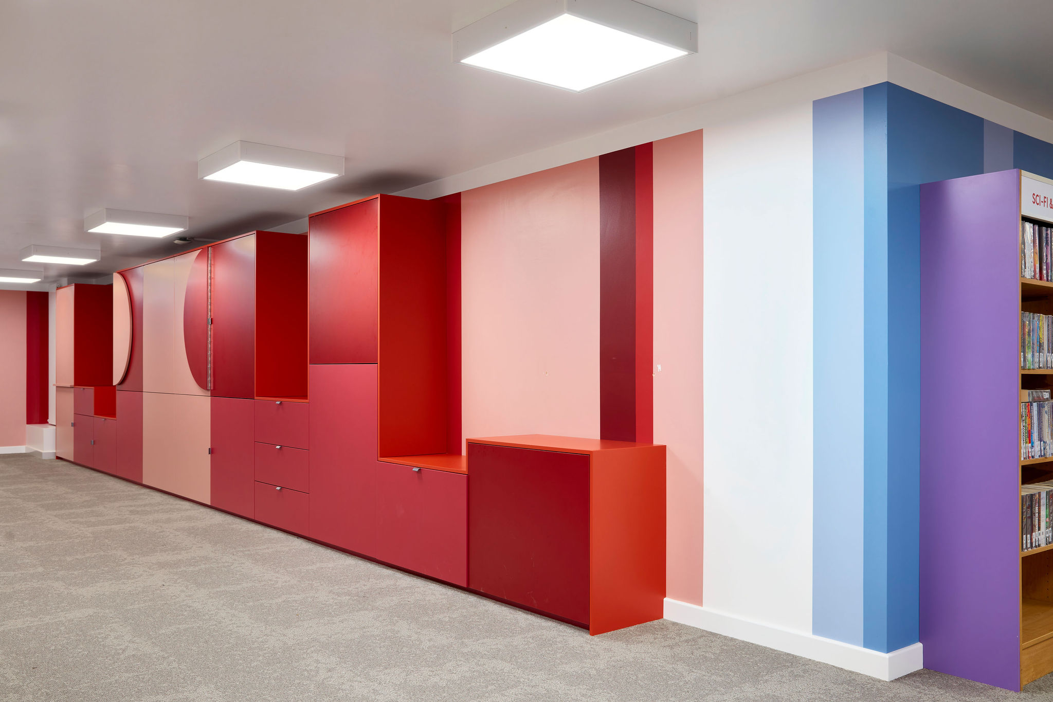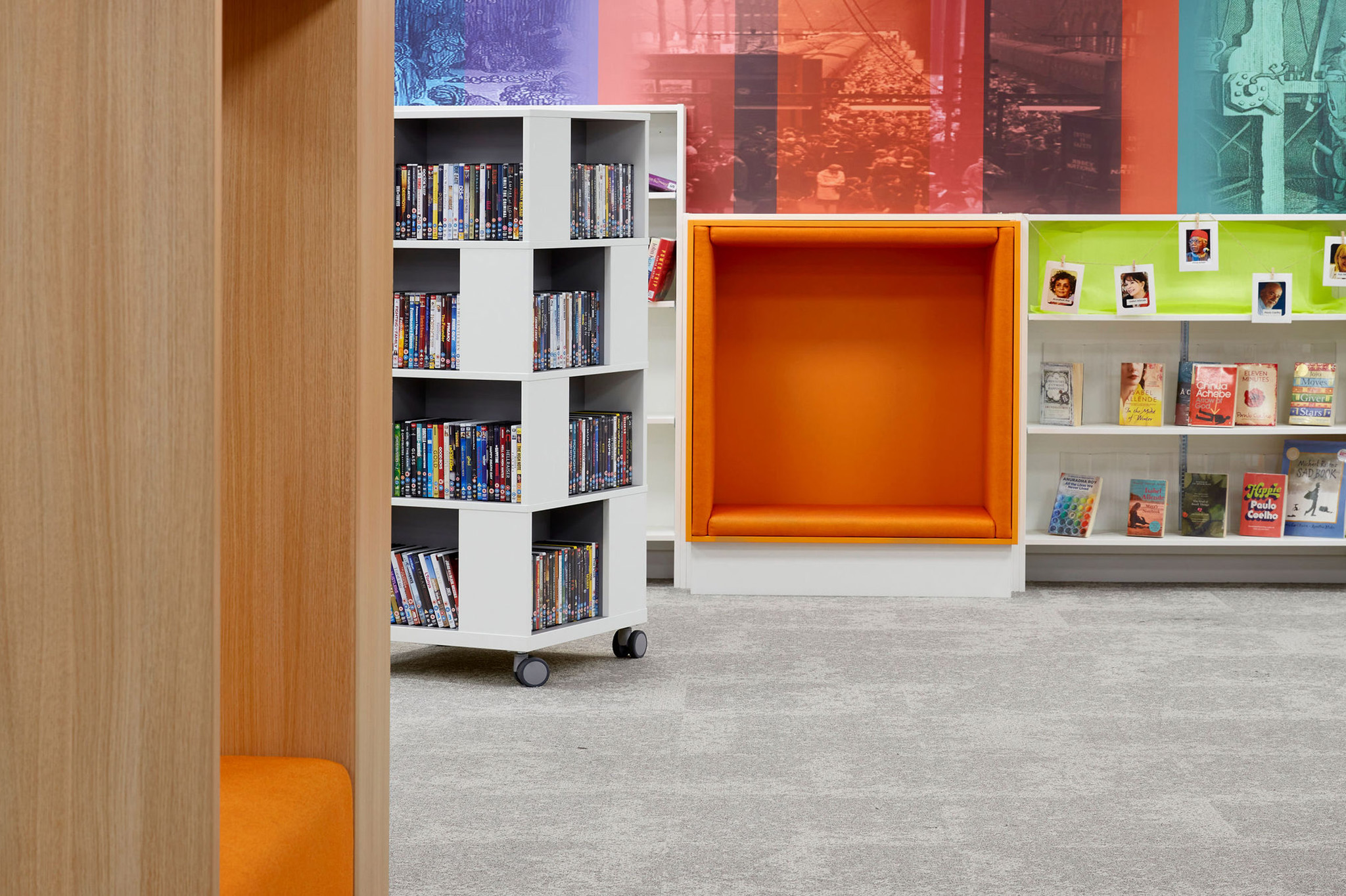 Our brief was to create a modern, vibrant, welcoming design that reflected this heritage of the area. The reception area was redesigned to consider the needs of the Housing Estate team as well as the Library Service and to reflect use of the library, which was predominately by families with young children and City workers. The low level island mobile shelving allows for easy flexibility and movement to open up and expand the space for group activities whilst the cocoon seating encourages a safe nook for quiet reding.