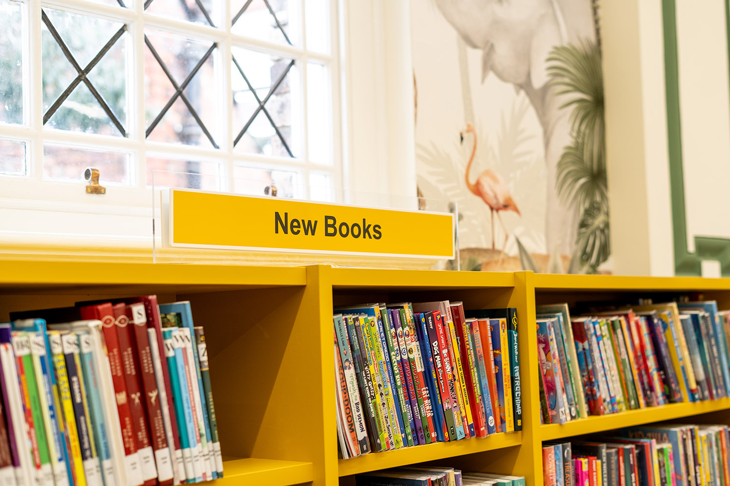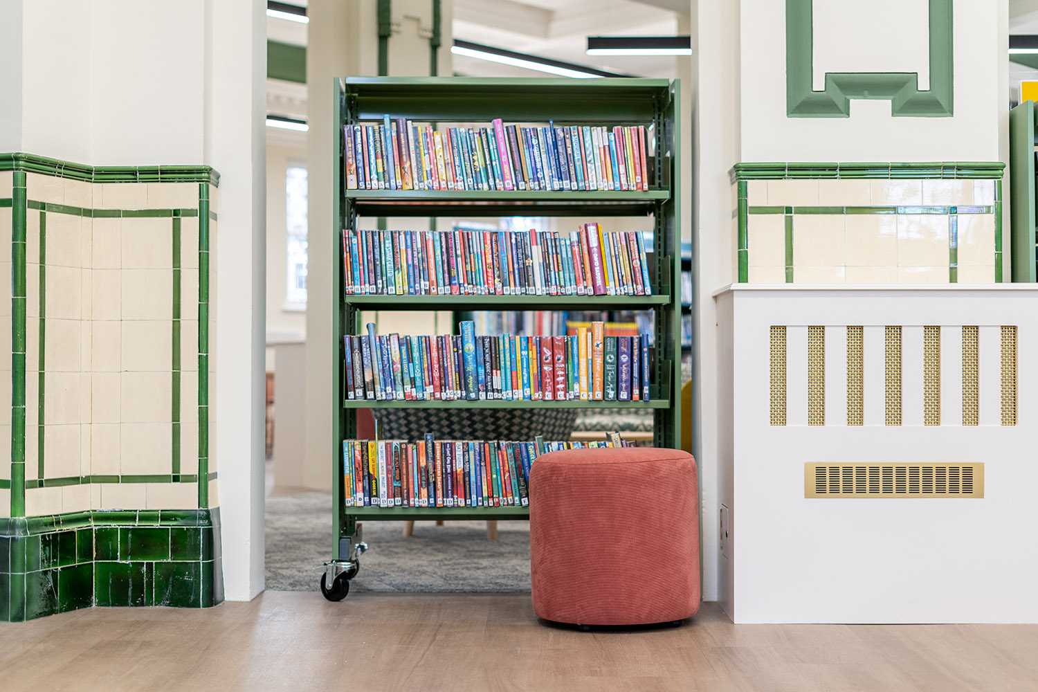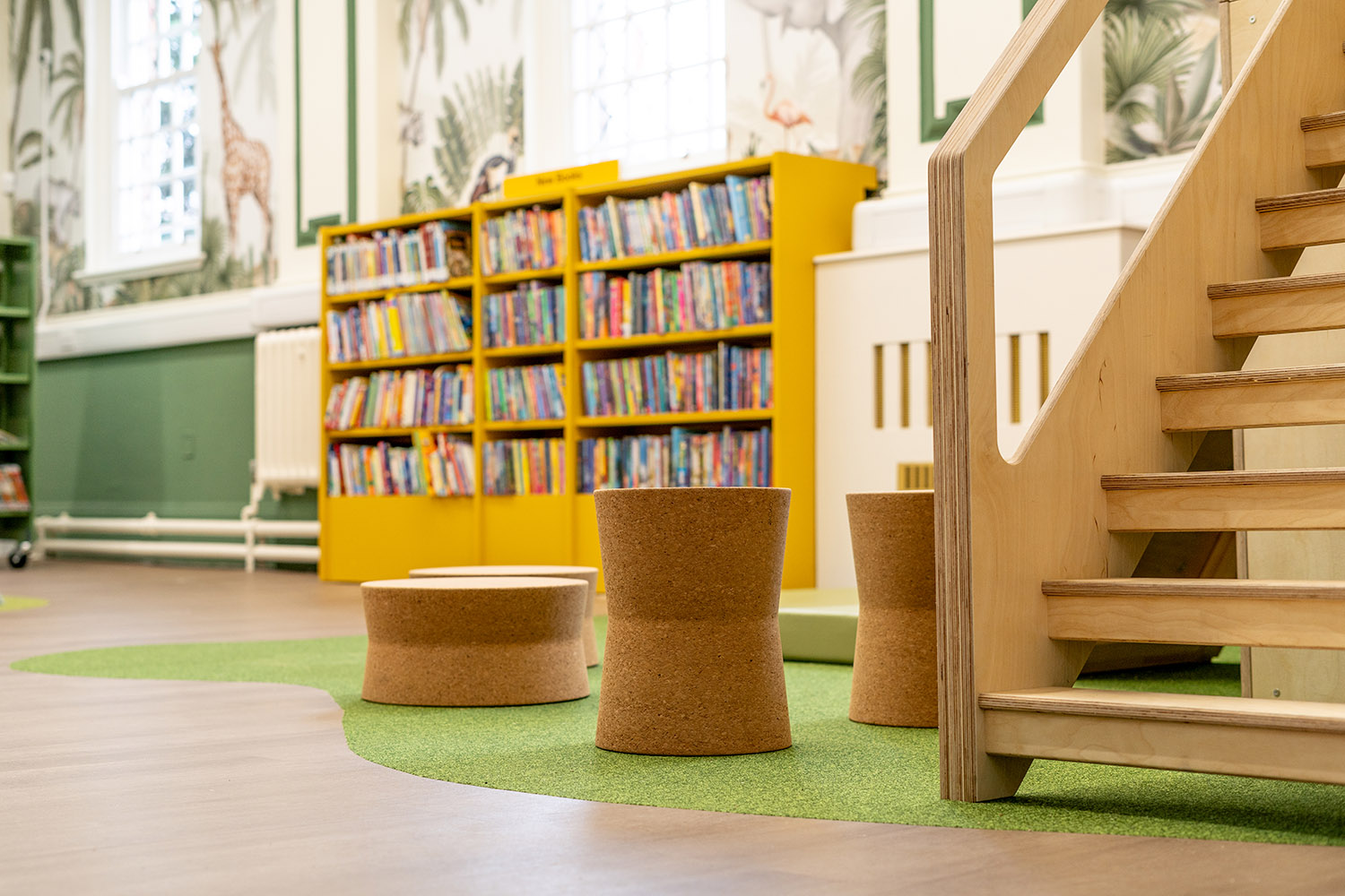 The children’s library captivates with a jungle-themed play zone, fostering creativity and learning through interactive installations. Bold colours, bespoke furniture and accessible shelving create an inclusive environment for young readers.