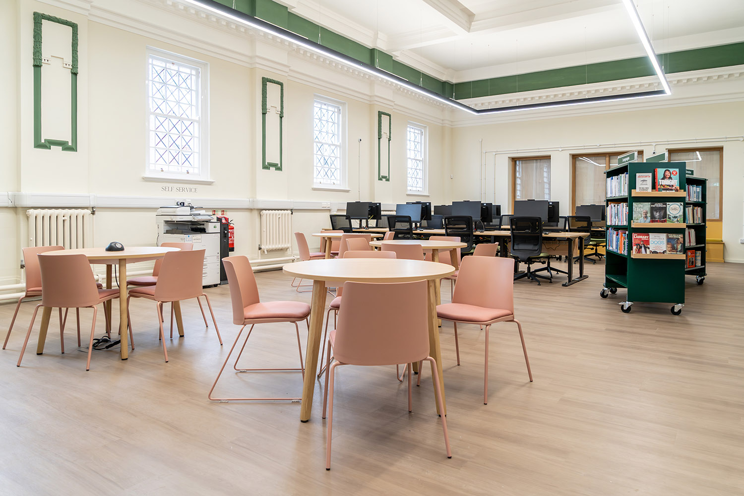 A seamless integration of classic and contemporary design features a heritage-inspired palette and preserved signage, enhancing clarity and flow. Flexible layout configurations support diverse activities, from quiet reading to collaborative learning.