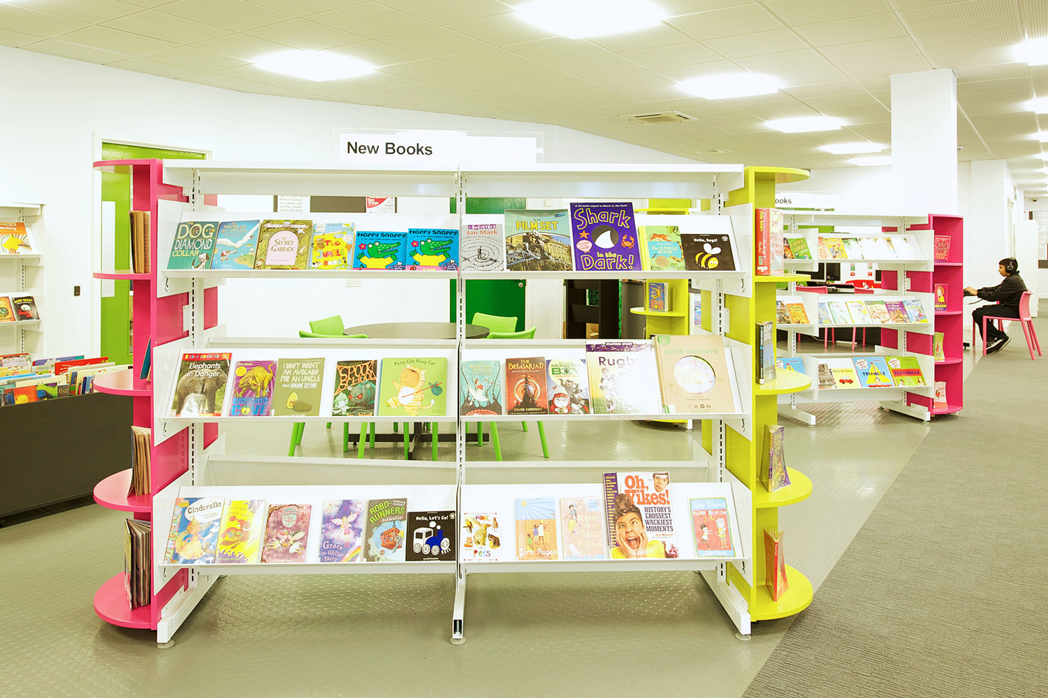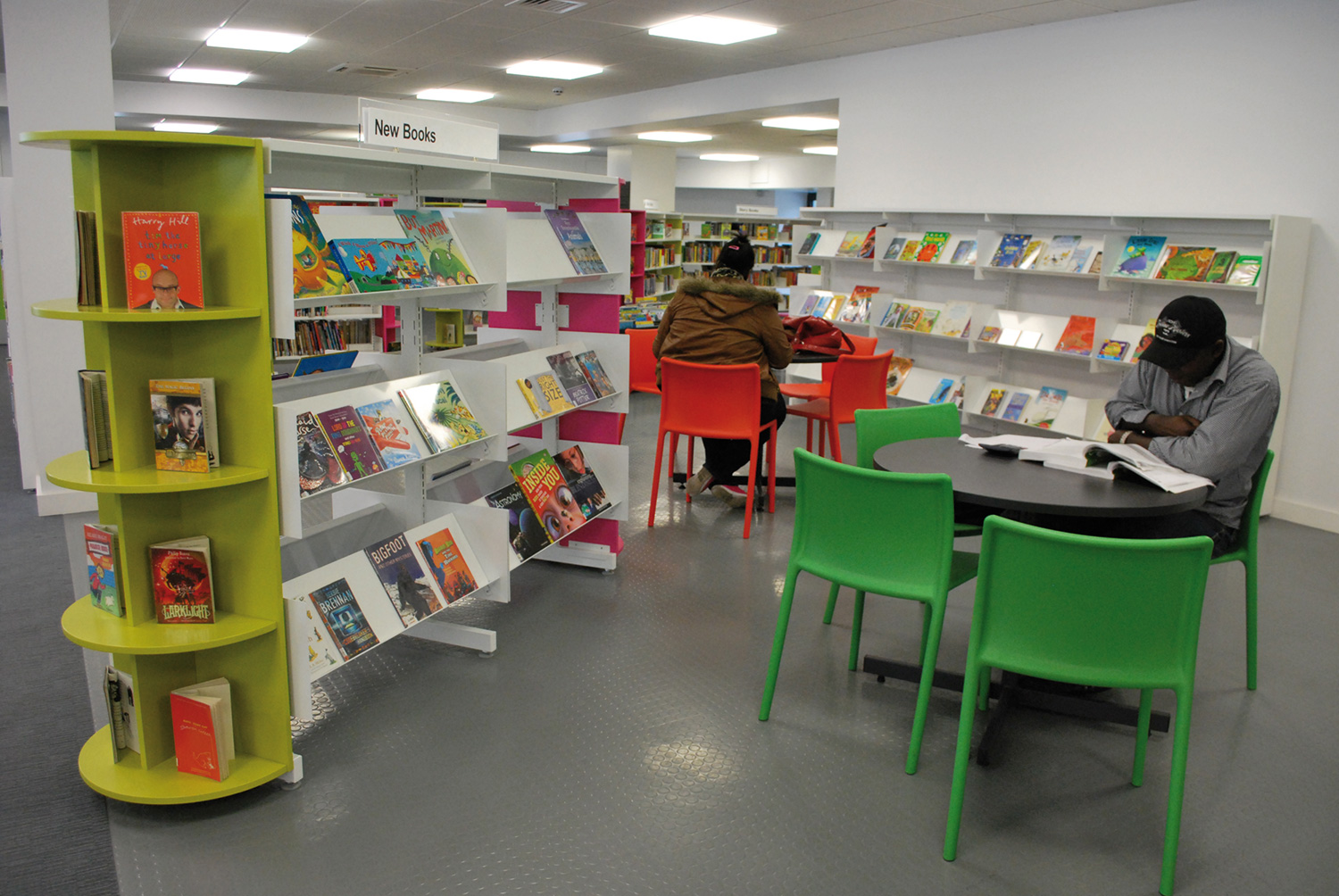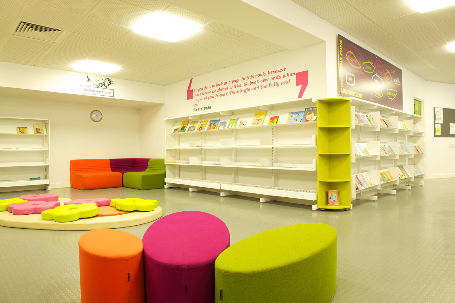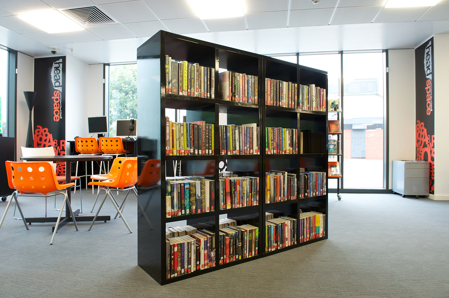 The library is equipped with Classic Steel Shelving System and specially made key pieces of furniture, designed to highlight the current quick pick furniture. The library share the same basic concept as Beswick, Brooklands and the Central Library in Manchester, but the unique colour themes and a couple of characteristics details give the library its own identity.