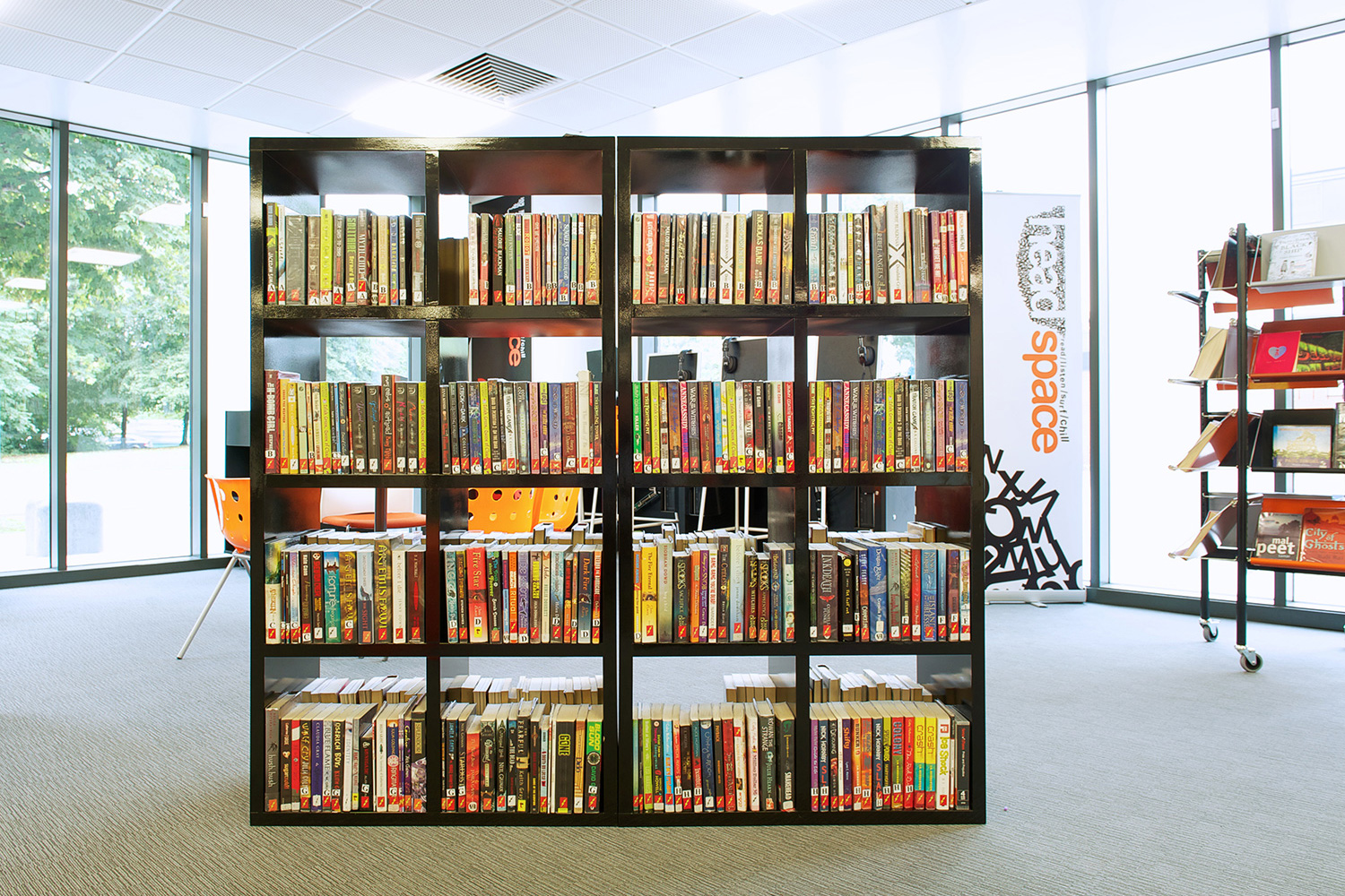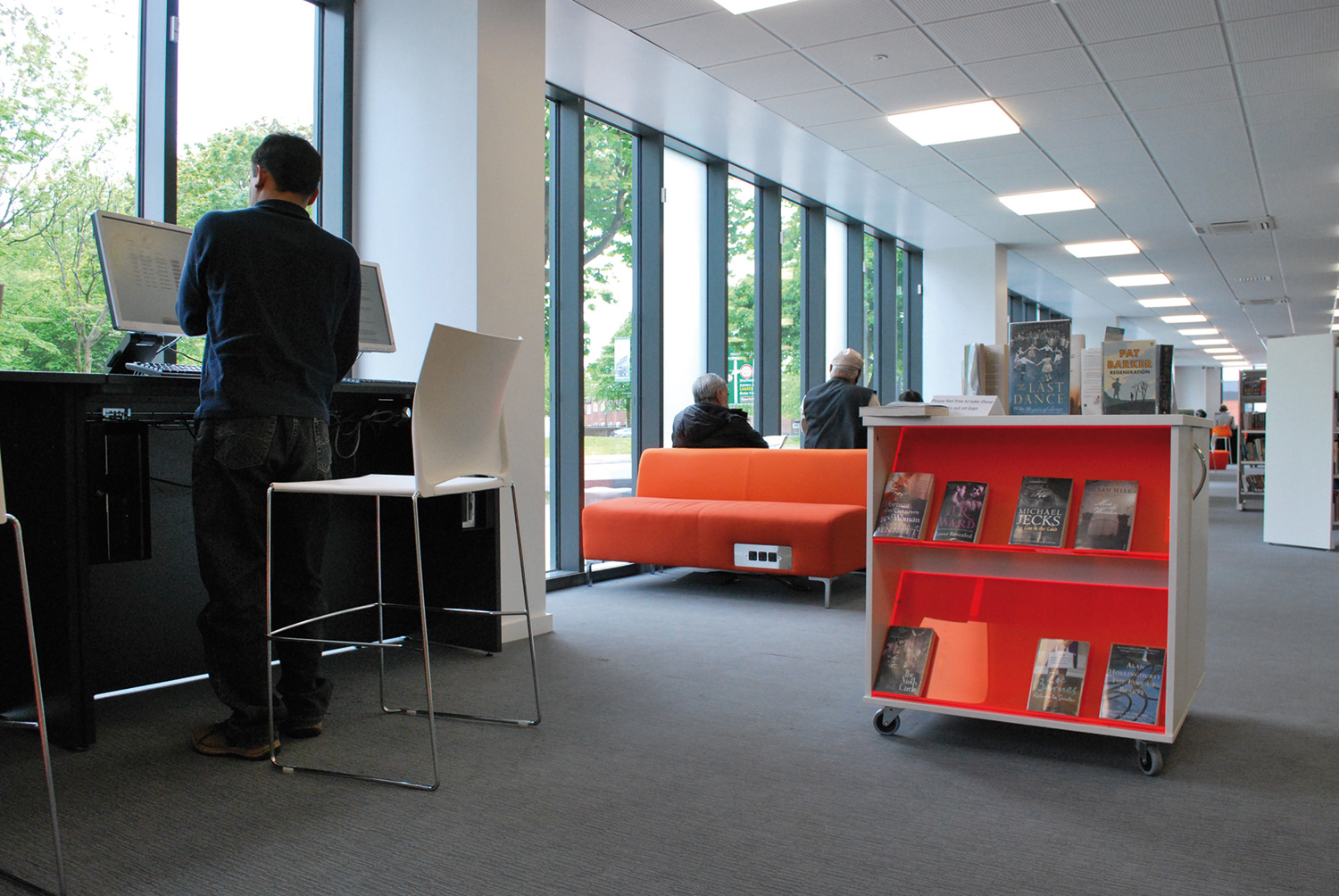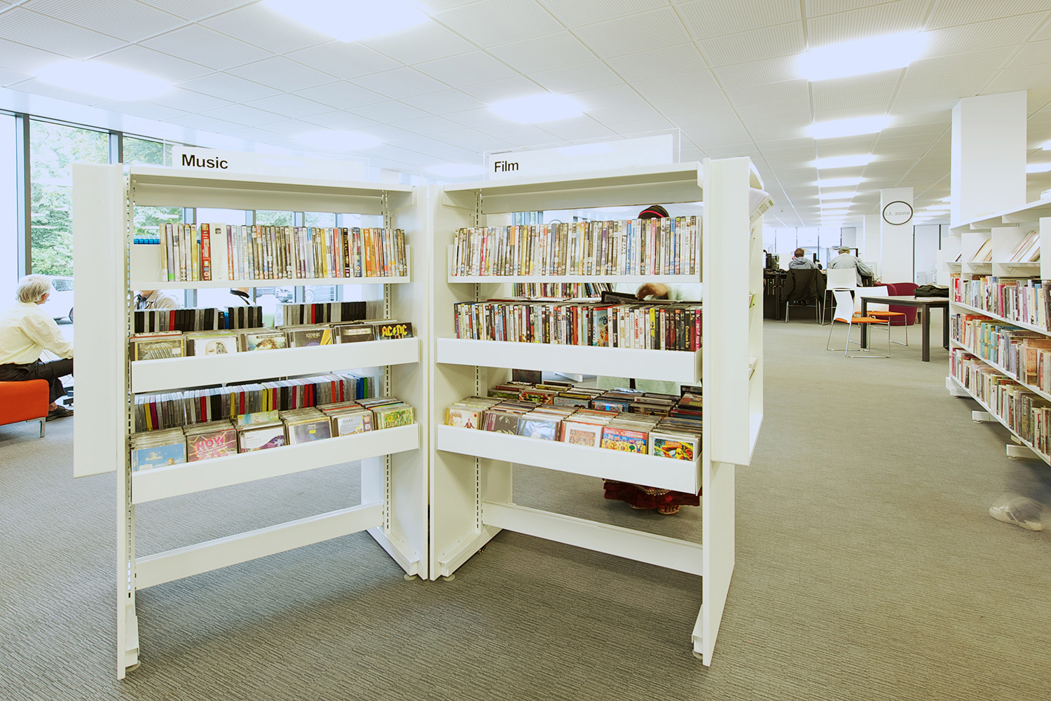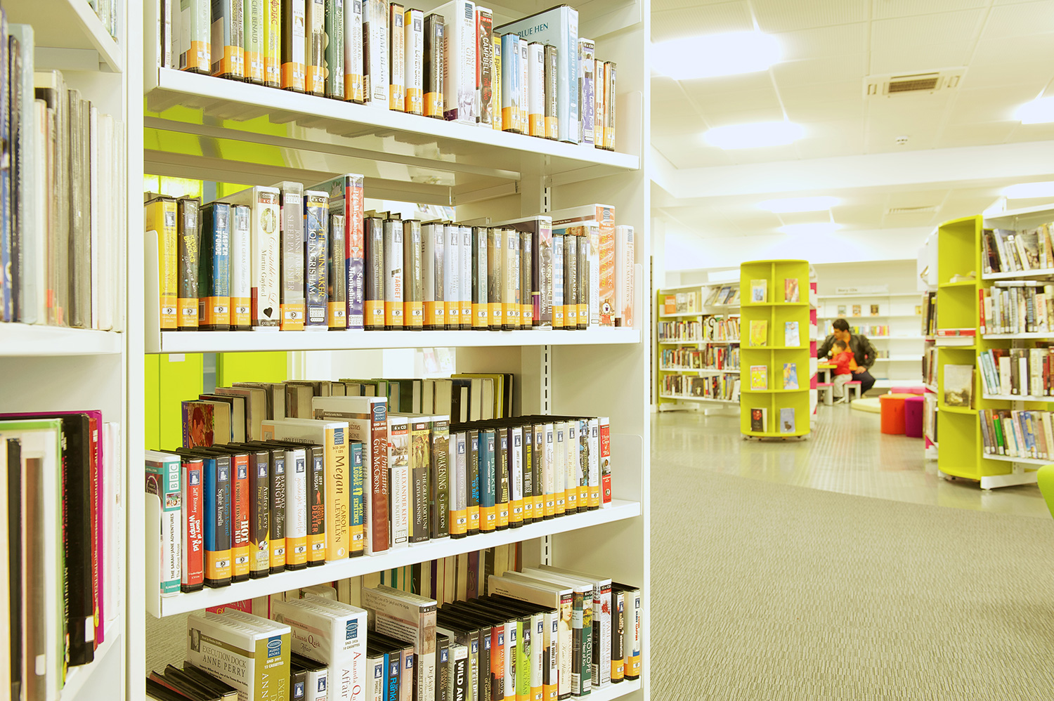 The library is equipped with Classic Steel Shelving System and specially made key pieces of furniture, designed to highlight the current quick pick furniture. The library share the same basic concept as Beswick, Brooklands and the Central Library in Manchester, but the unique colour themes and a couple of characteristics details give the library its own identity.