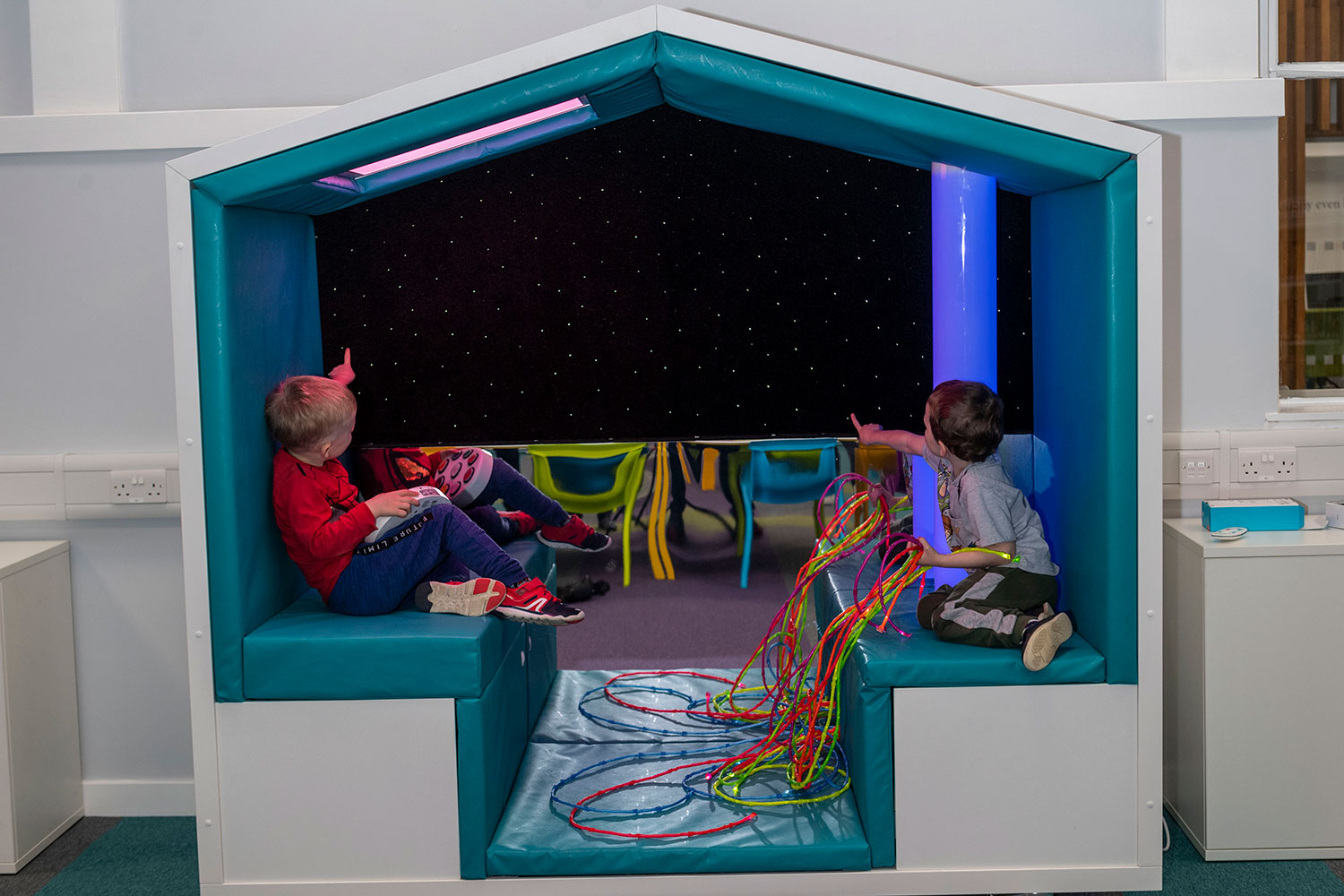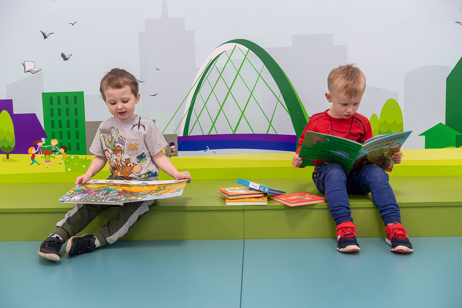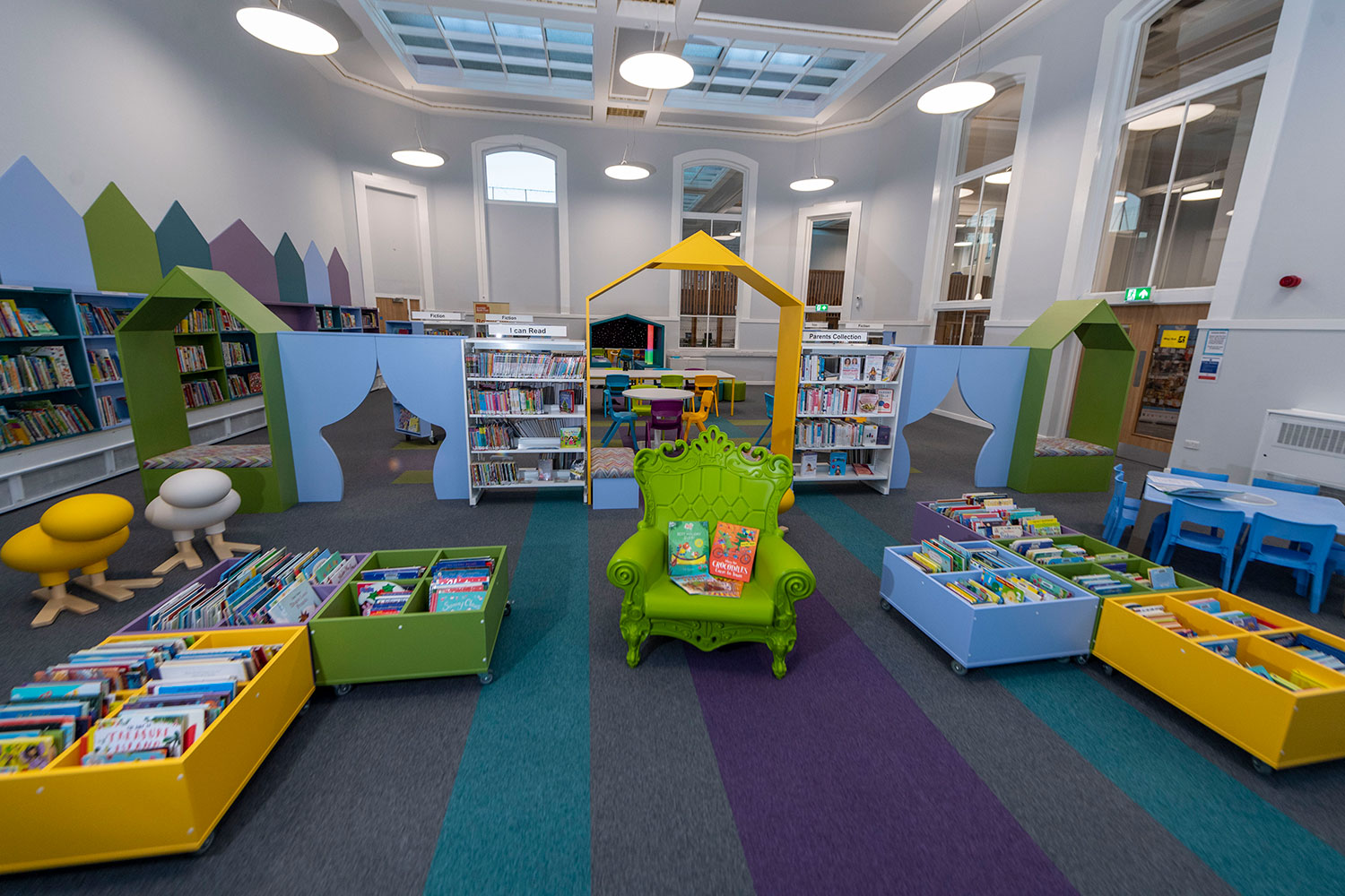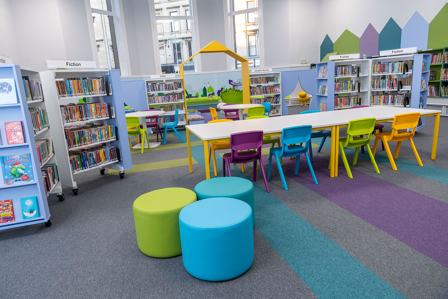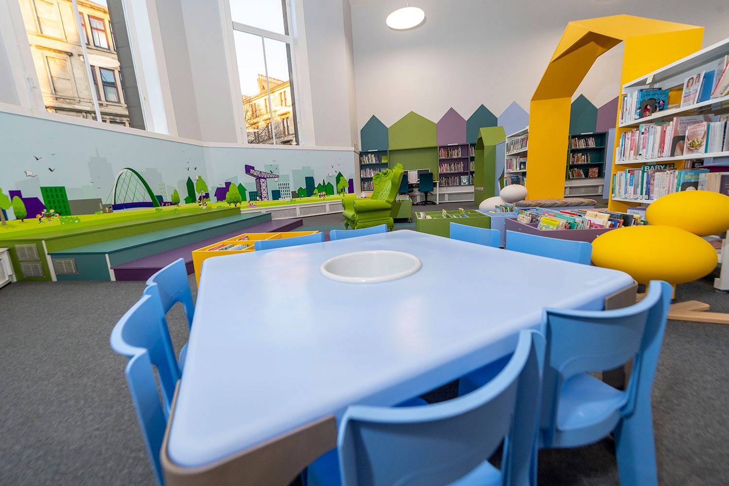 The Children’s Library has been completely revamped. Brightly coloured walls, shelving and furniture capture users attention and creates a space where youngsters want to spend time. A multi-platform stage can be used for events and a sensory nook, the first available in Glasgow, provides a safe space for children with additional needs.