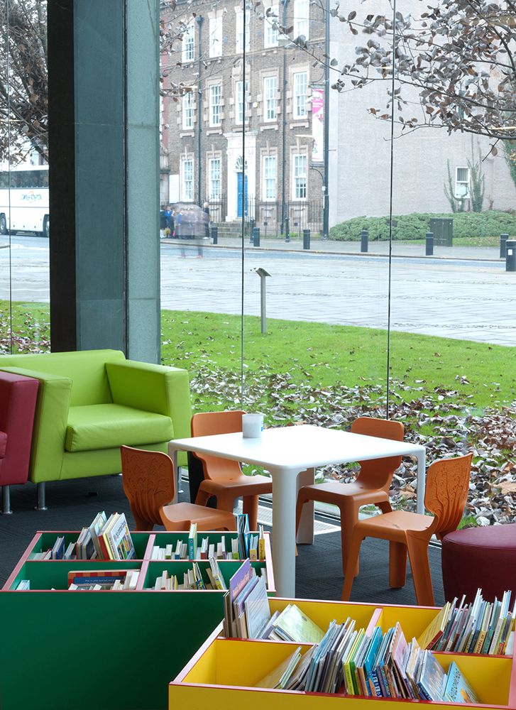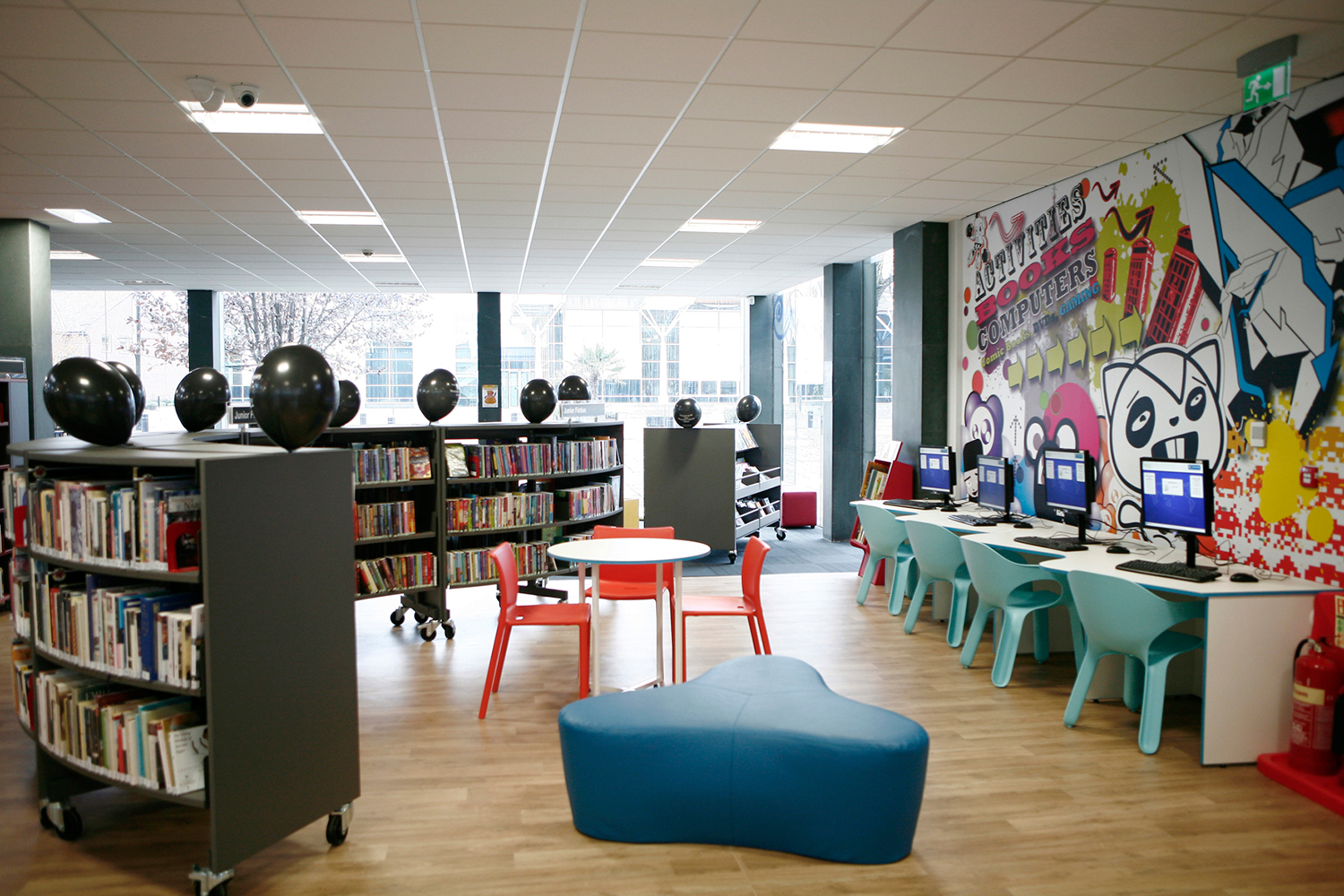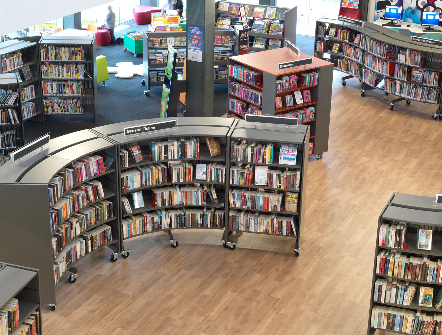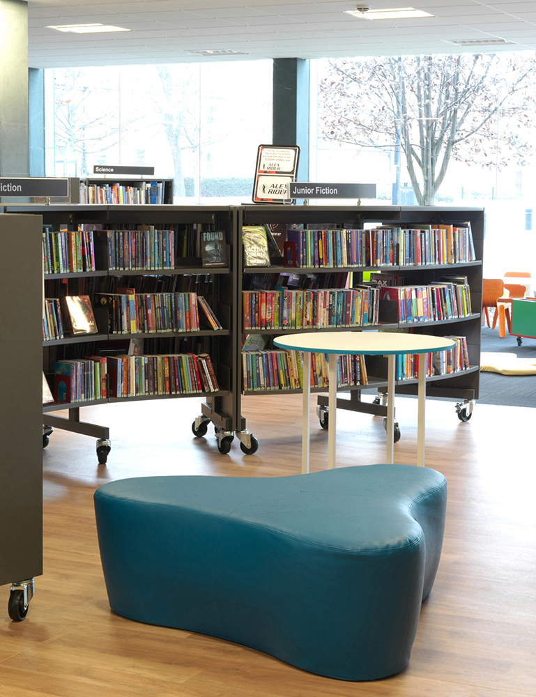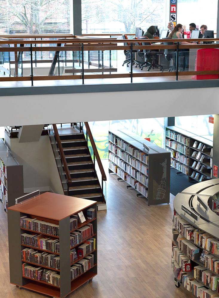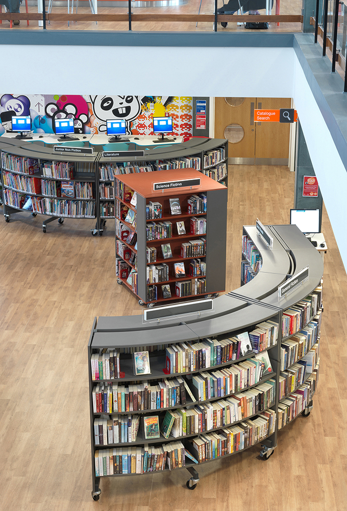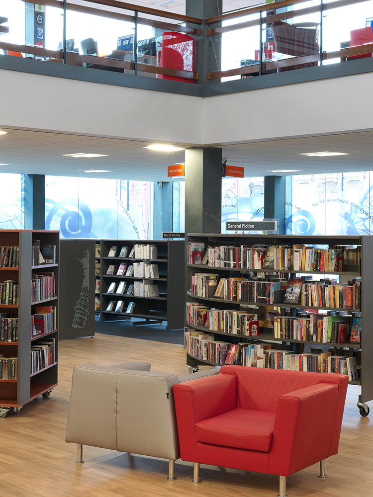 The library boasts state of the art technology with a specialist technology suite for blind and visually impaired people. There is also an area that is dedicated to local and family history where the use of Gothia Shelving with punched wooden end panels creates an environment that has a traditional quality about it whilst still maintaining the modern feel of the rest of the building.