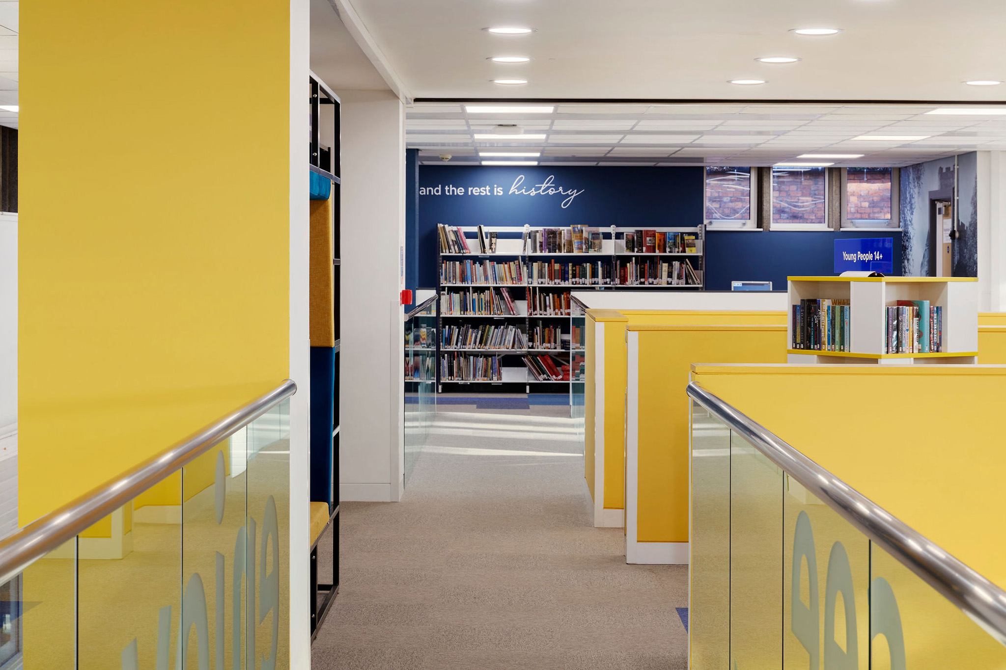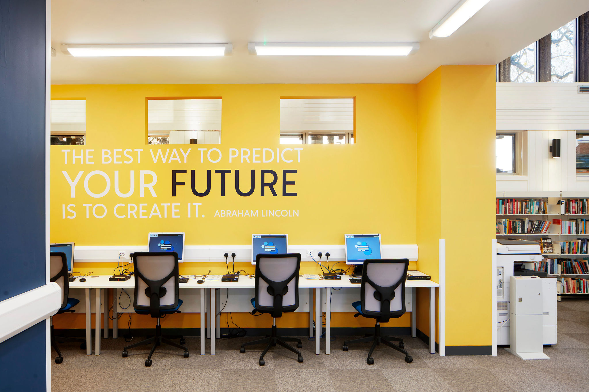 Special attention to detail was paid to the fabric selection and colours for all the soft furnishings. Thedesignconcept ltd. chose all the paint finishes throughout the library and these are complimented with the use of carefully selected digital graphics and inspirational quotes that lift the overall mood of the space; allowing for more positive and motivated users. We designed a carpet layout that also punches with random placement of colour that will work with any future layout of the space.