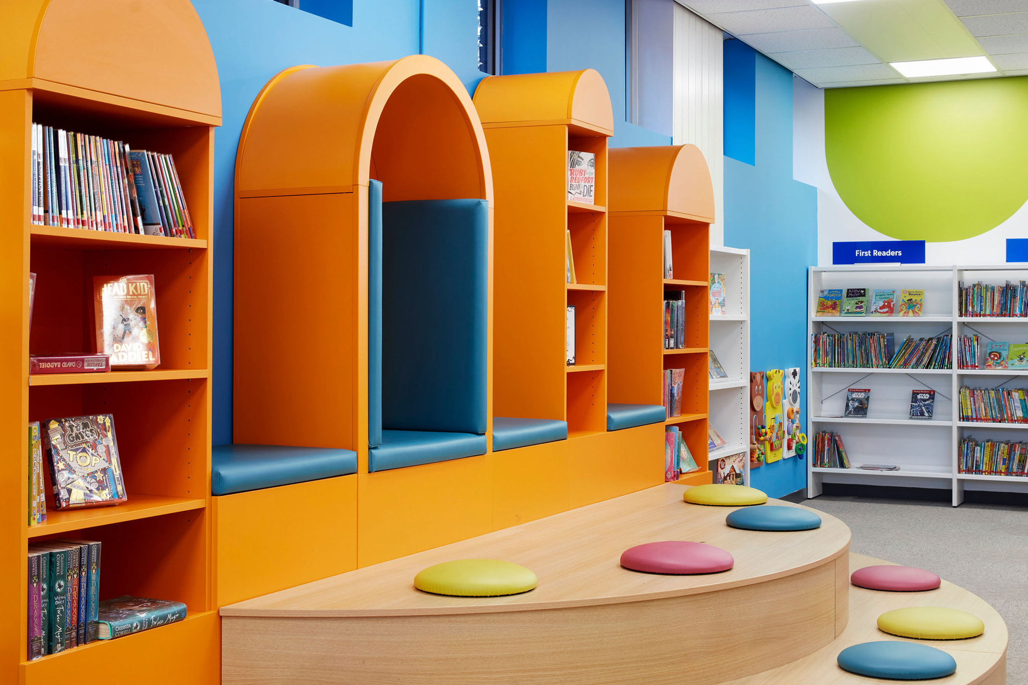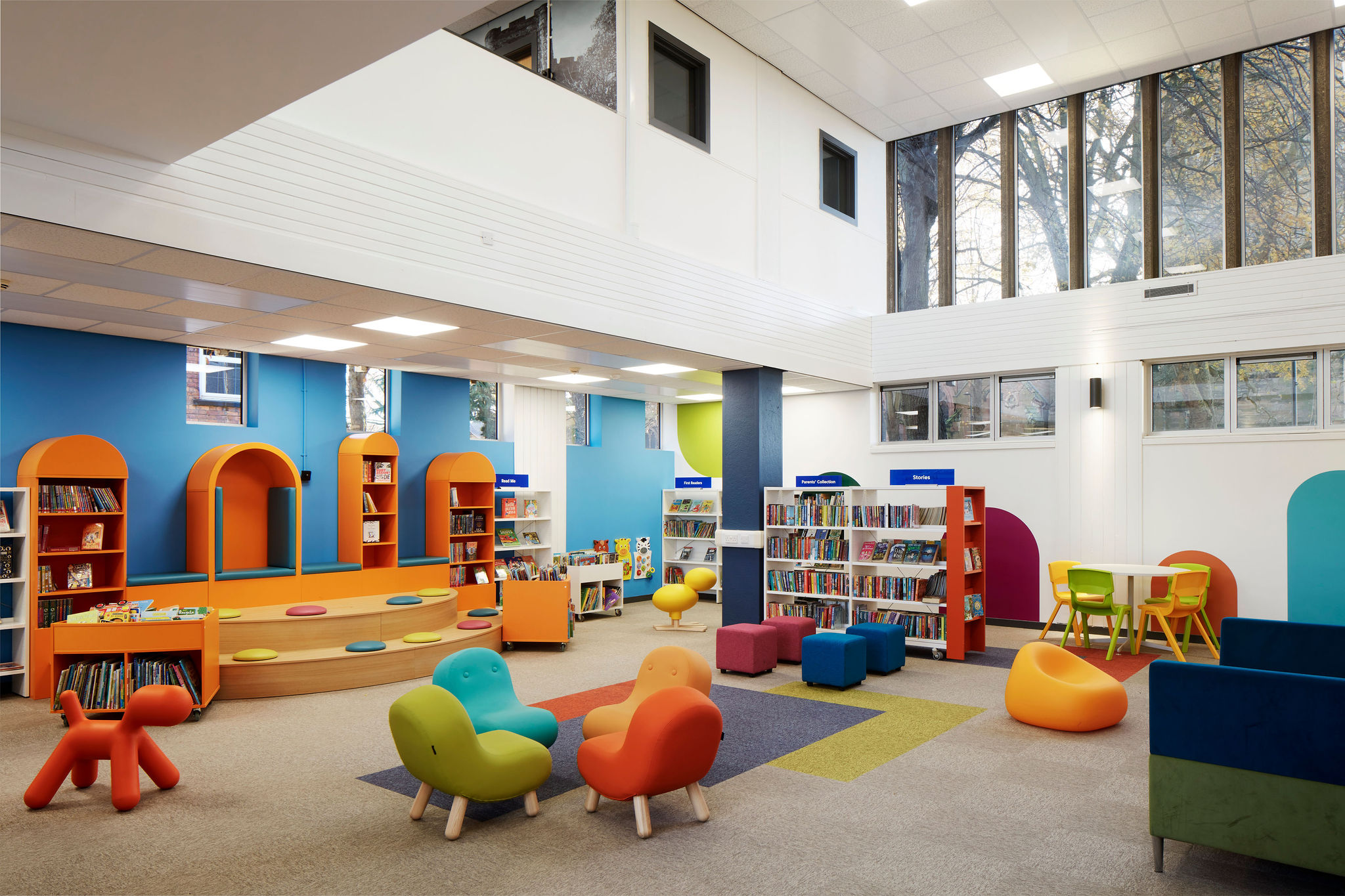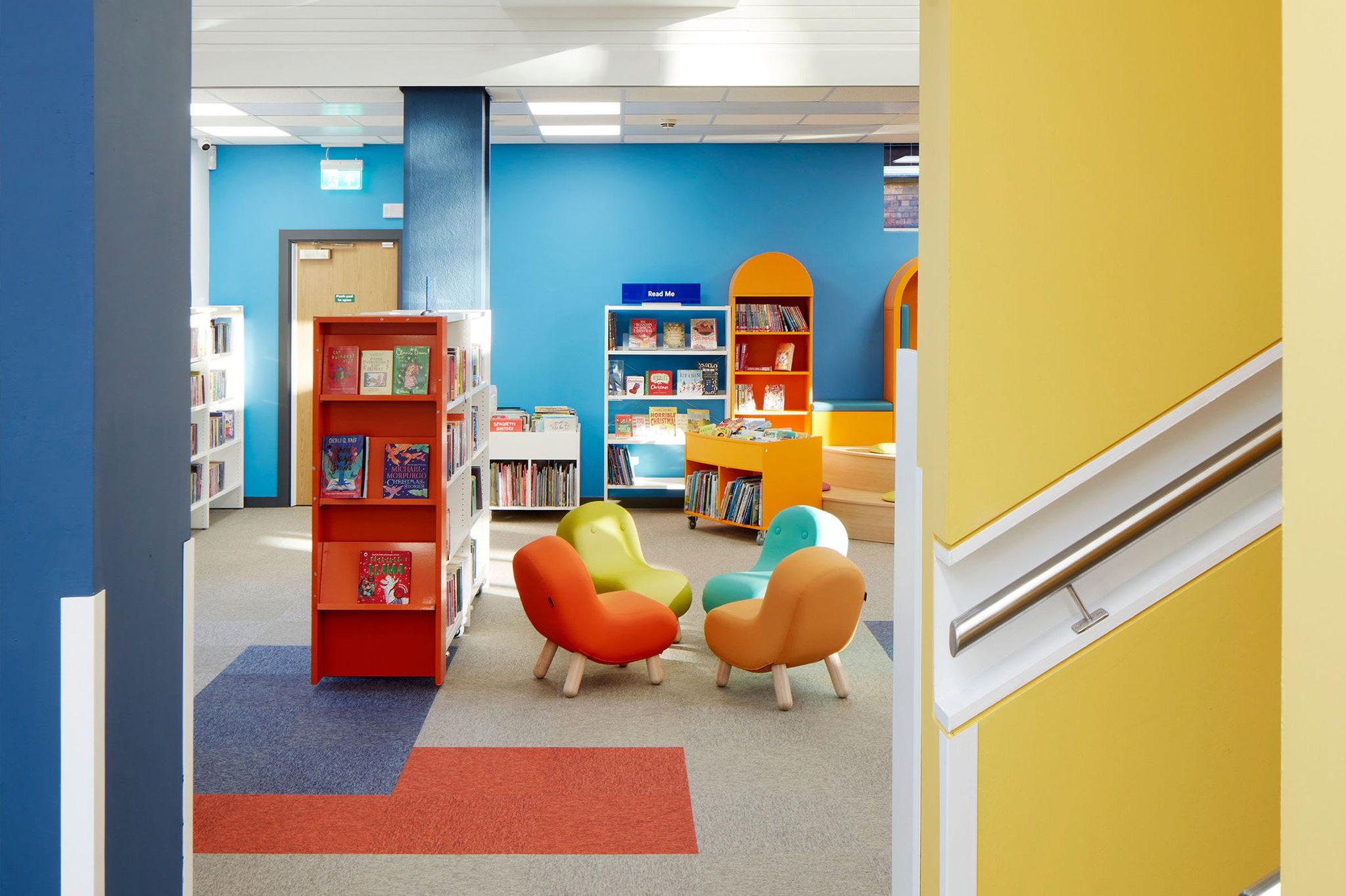 The children’s area is fun and inviting with bright colours and fun shapes designed to entice children into the library and encourage them to explore the wide variety of books. The bespoke stage area is exceptionally multifunctional, allowing for both individual and group reading activity. Incorporating sensory elements into the design of the children’s space was really important to make sure the area felt inclusive and welcoming for all families.