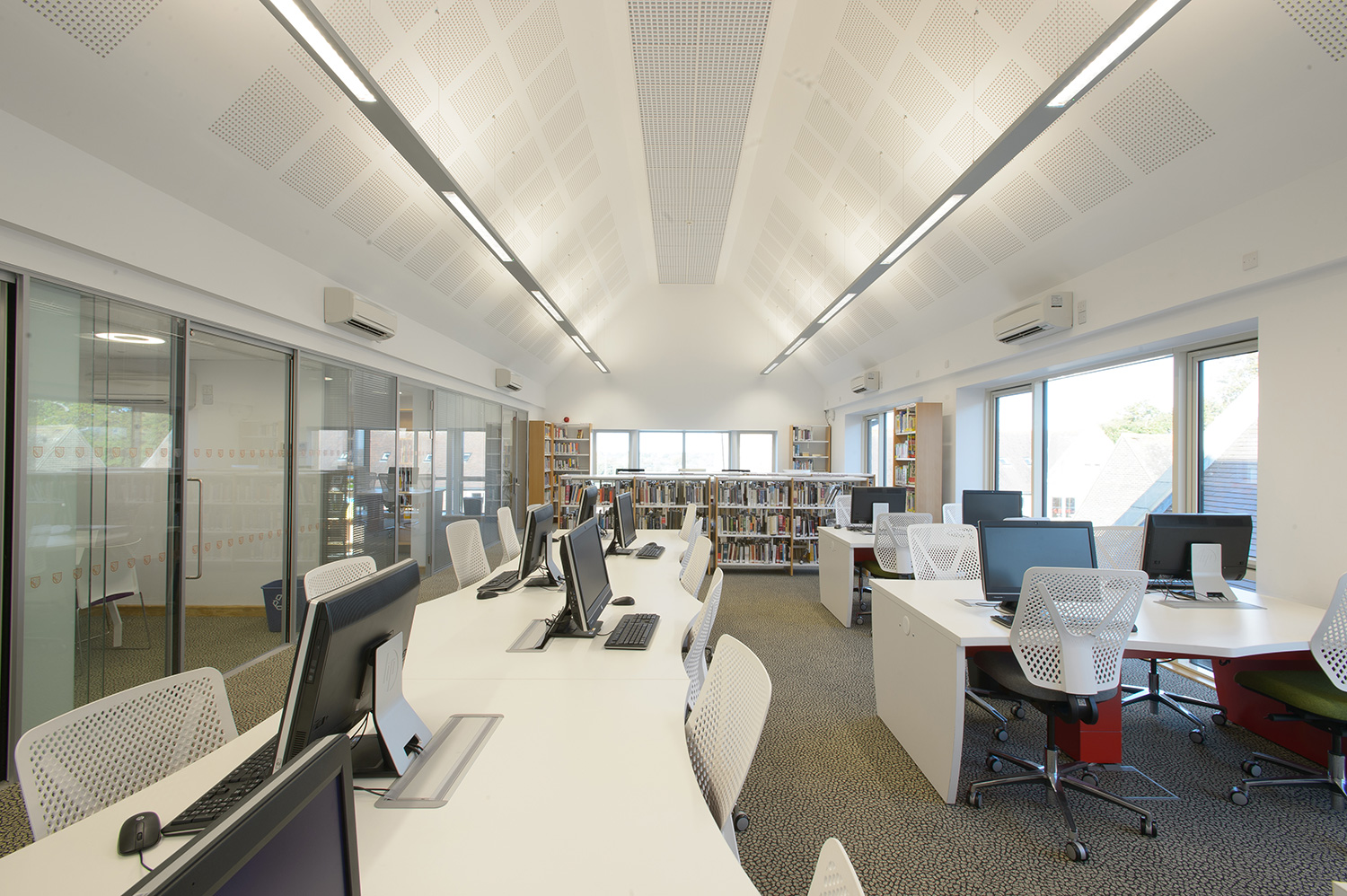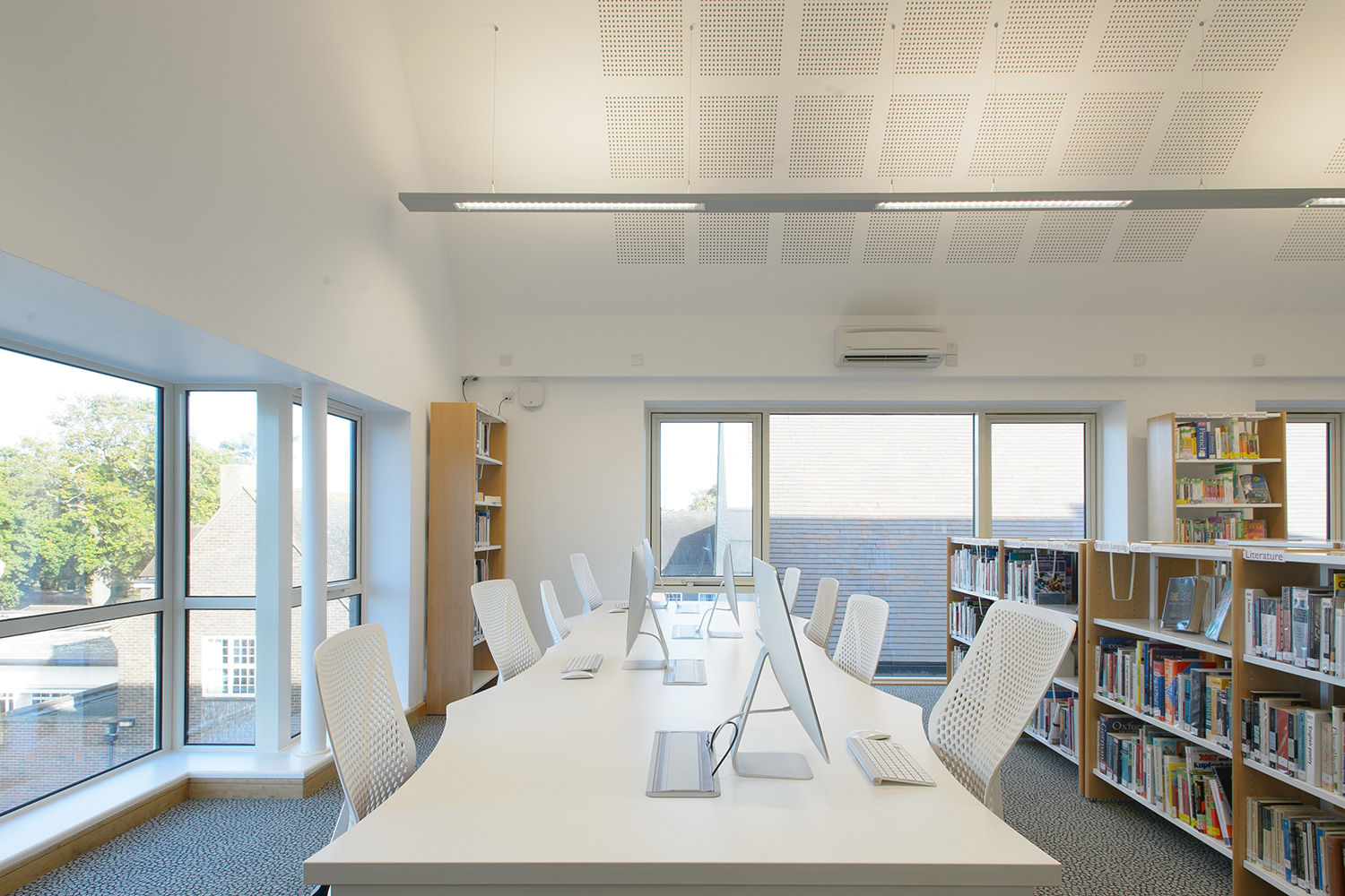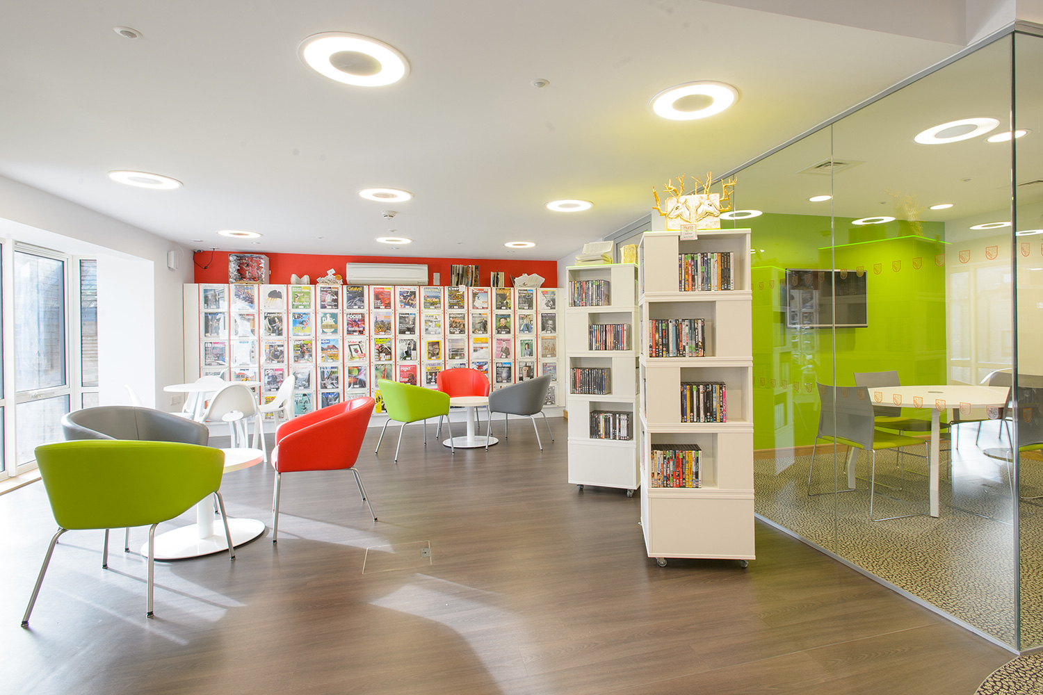 Thedesignconcept provided a furniture and shelving solution for a new academic and creative hub for Sixth Form Students at the College. All desking was provided with surface mounted power allowing each station to be used with a fixed PC or left free for students to plug in their own devices via socket or USB points. A purpose built magazine and journal wall was provided to allow the clear and attractive display of content with the ability to store archive issues. Furniture was also provided for the student kitchen.