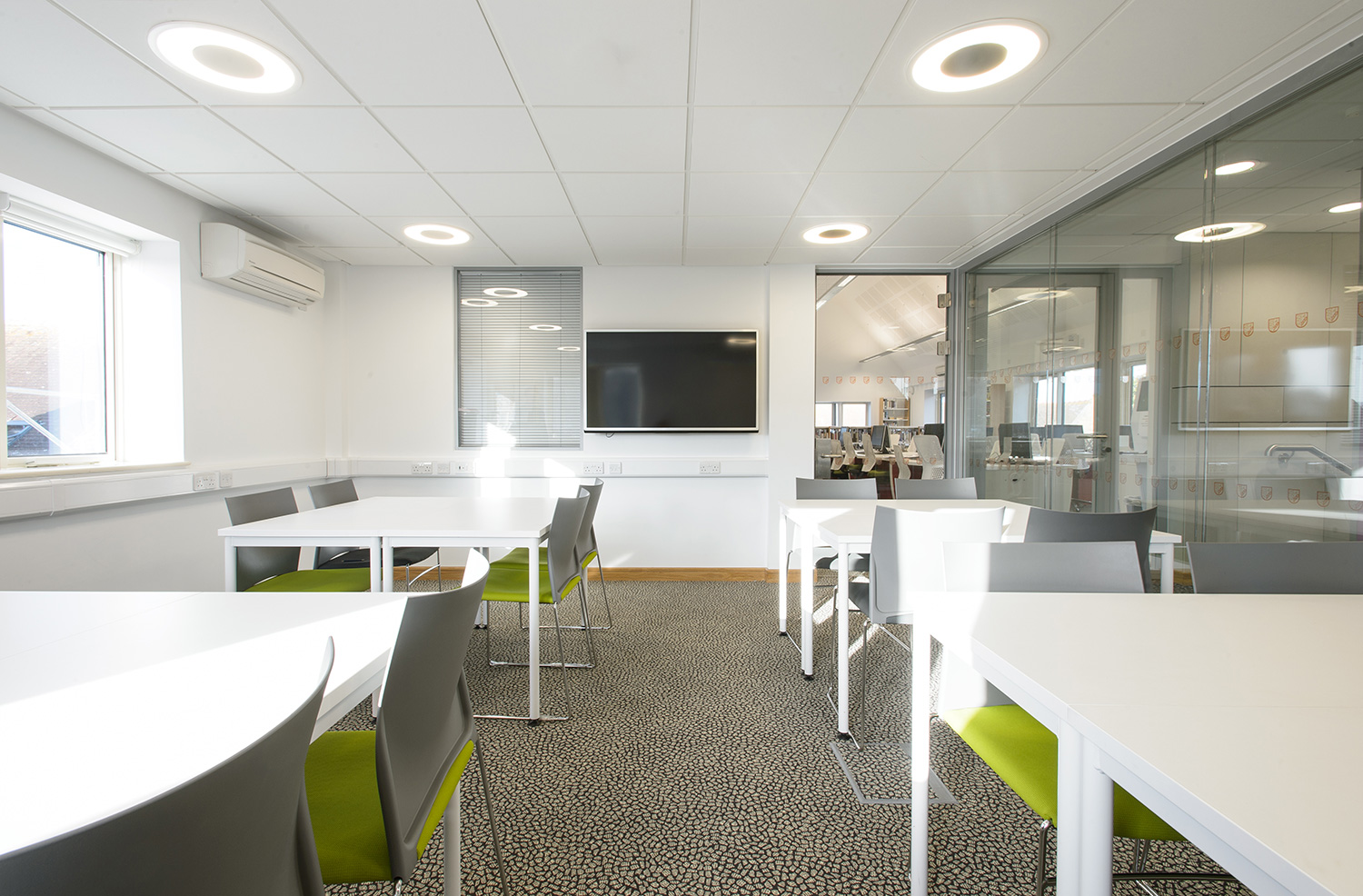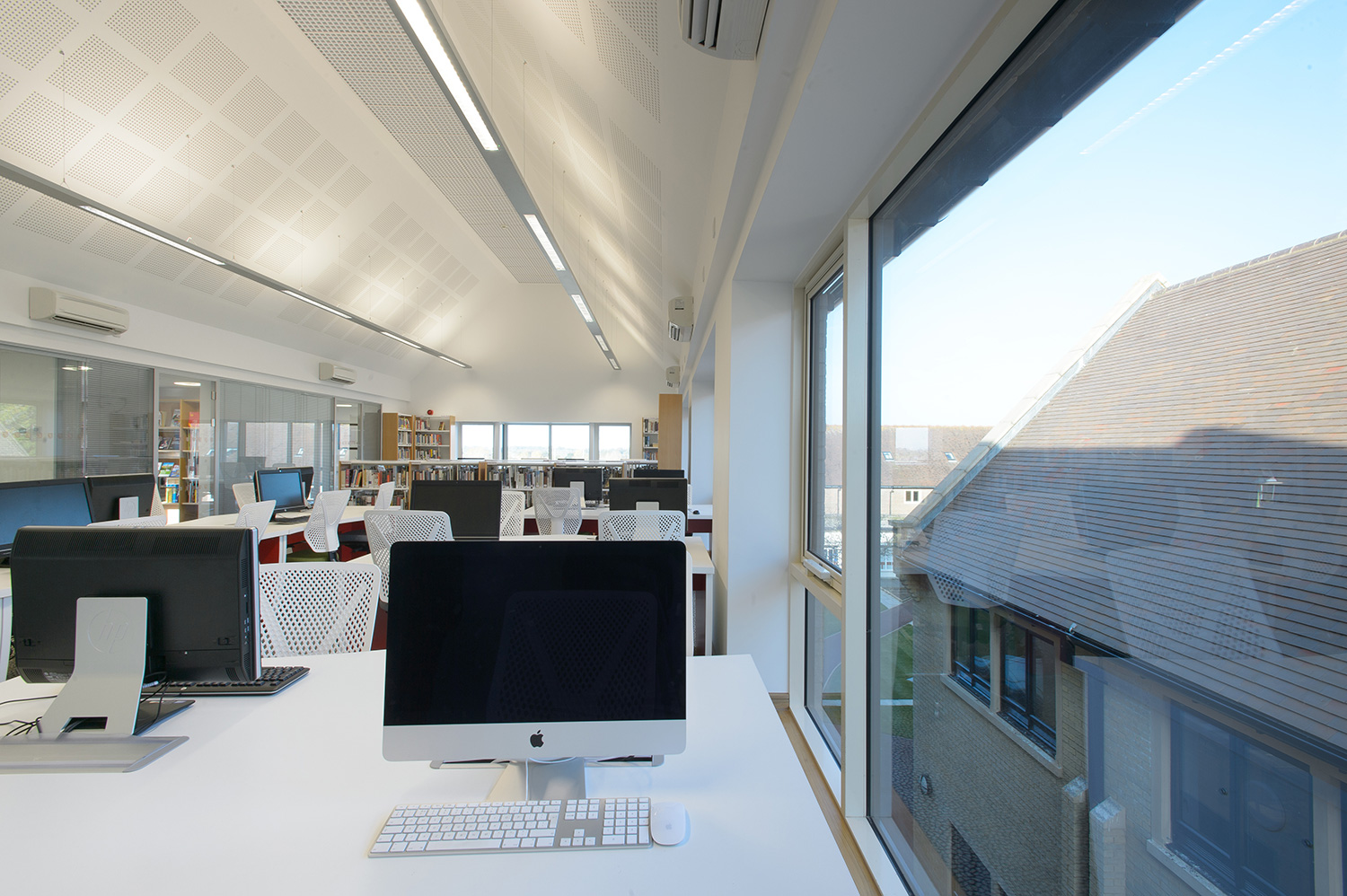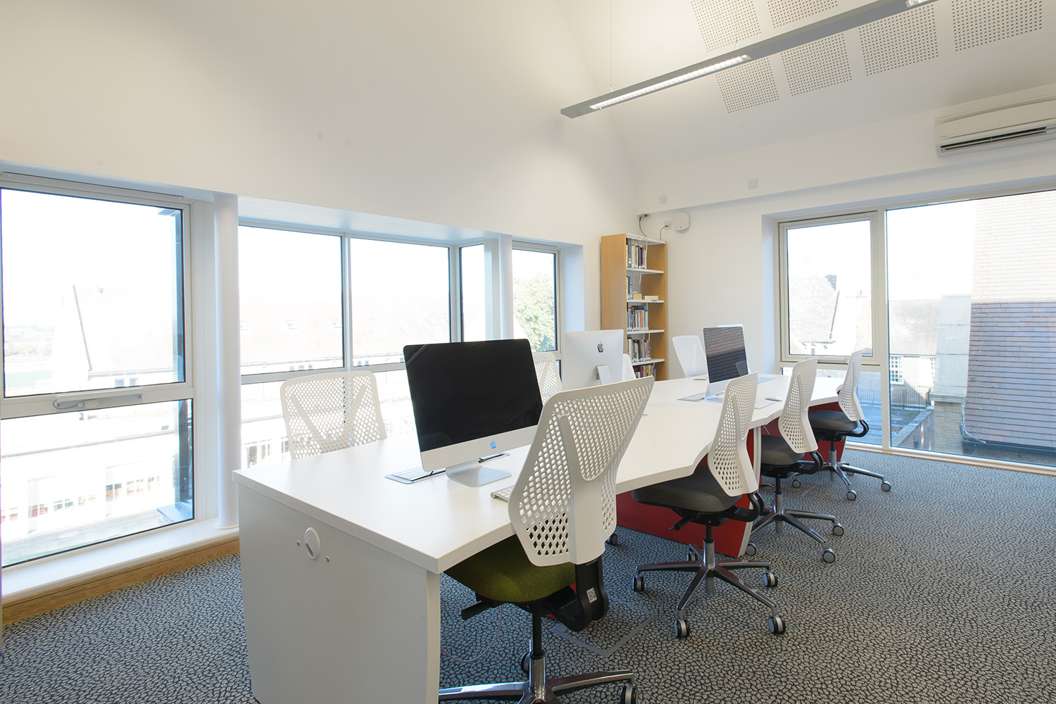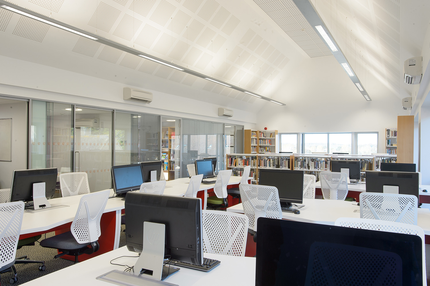 Thedesignconcept provided a furniture and shelving solution for a new academic and creative hub for Sixth Form Students at the College. All desking was provided with surface mounted power allowing each station to be used with a fixed PC or left free for students to plug in their own devices via socket or USB points. A purpose built magazine and journal wall was provided to allow the clear and attractive display of content with the ability to store archive issues. Furniture was also provided for the student kitchen.