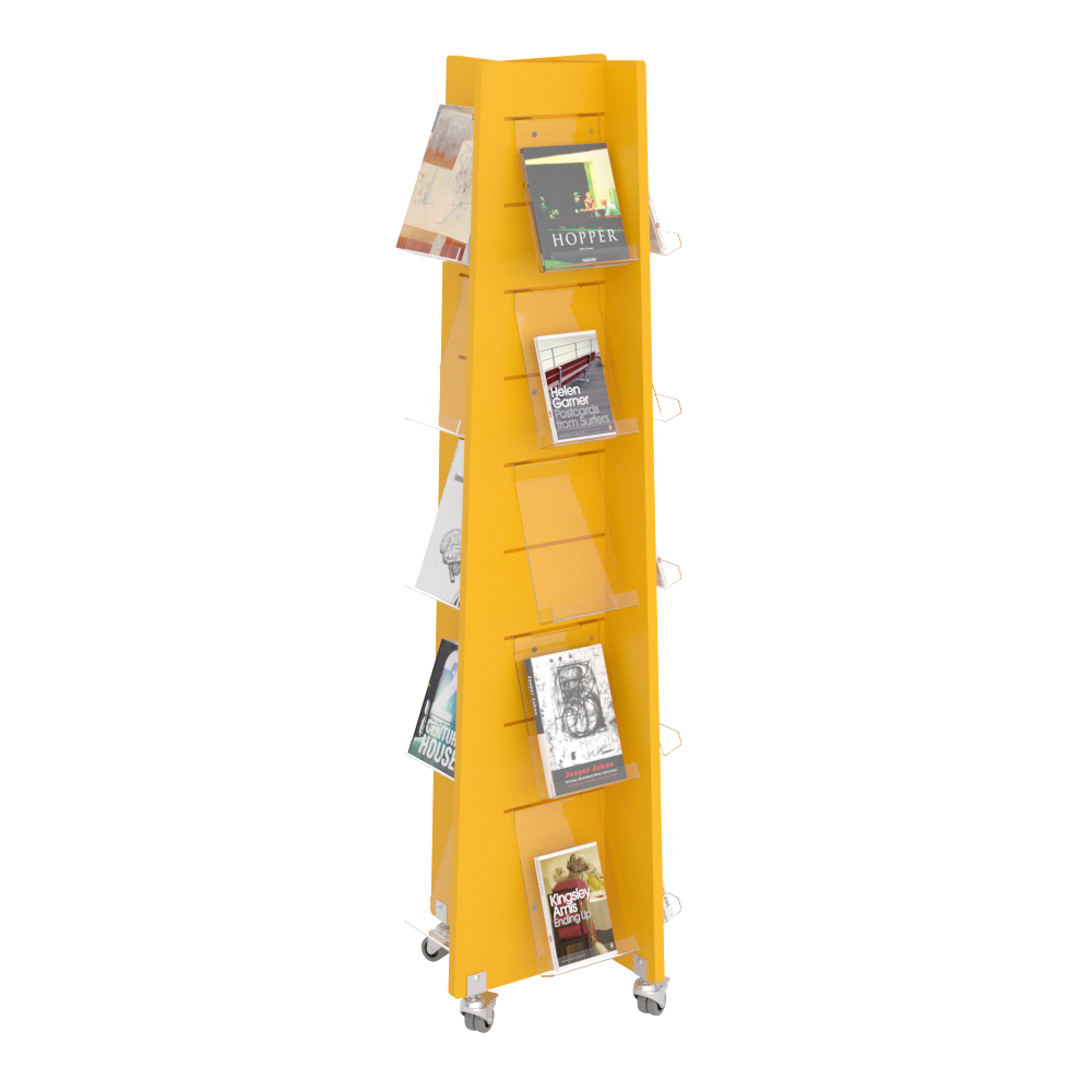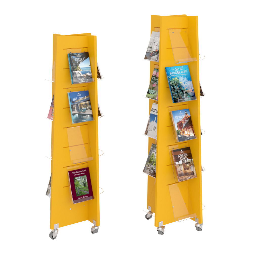 Four sided display tower for front-facing display of books, periodicals etc.