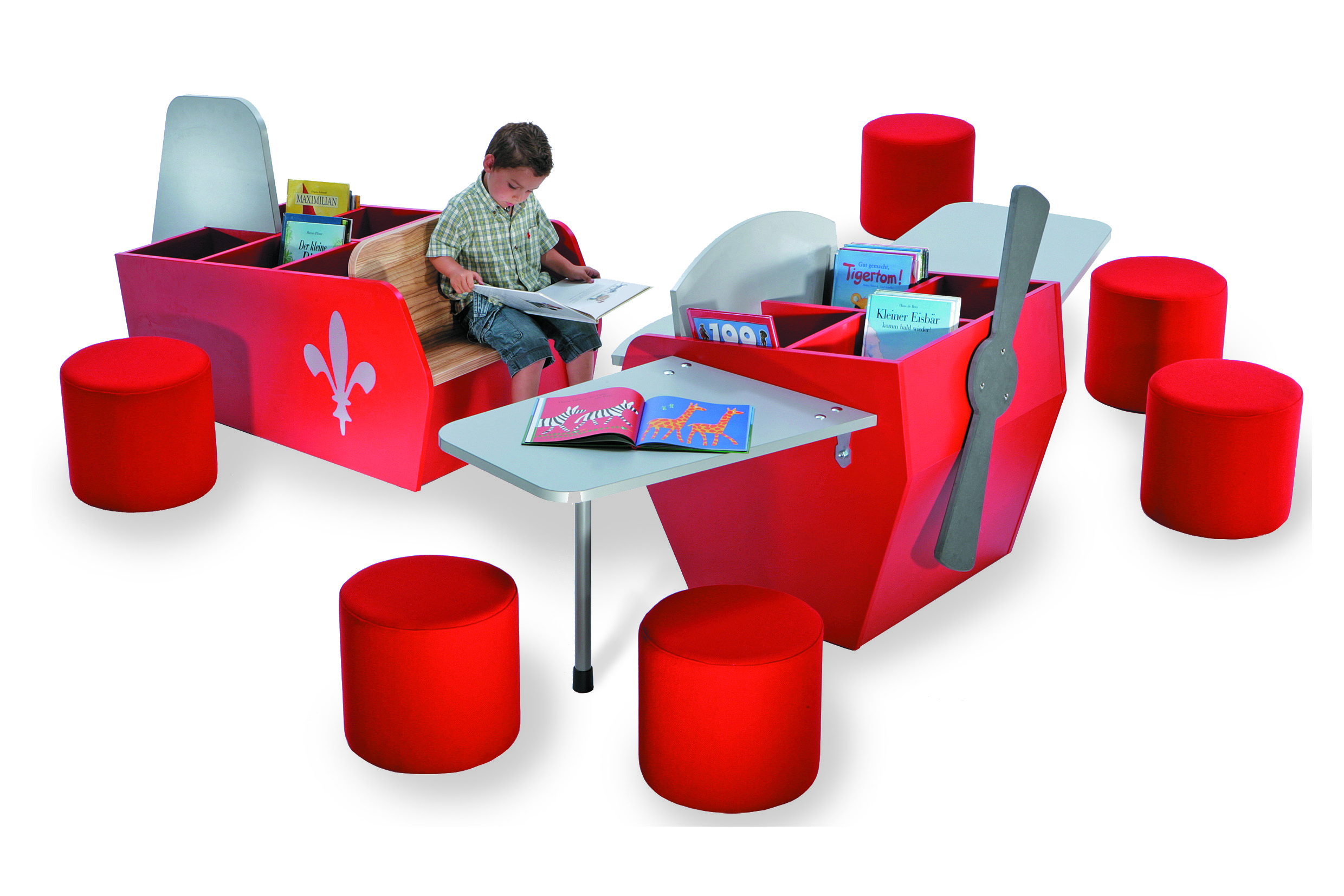 With two reading tables in the shape of wings attached at the sides, this aeroplane creates exciting book selection and reading options, whether sitting or standing. It also has the added benefit of practical yet creative storage capabilities. For safety reasons the propeller is fixed.