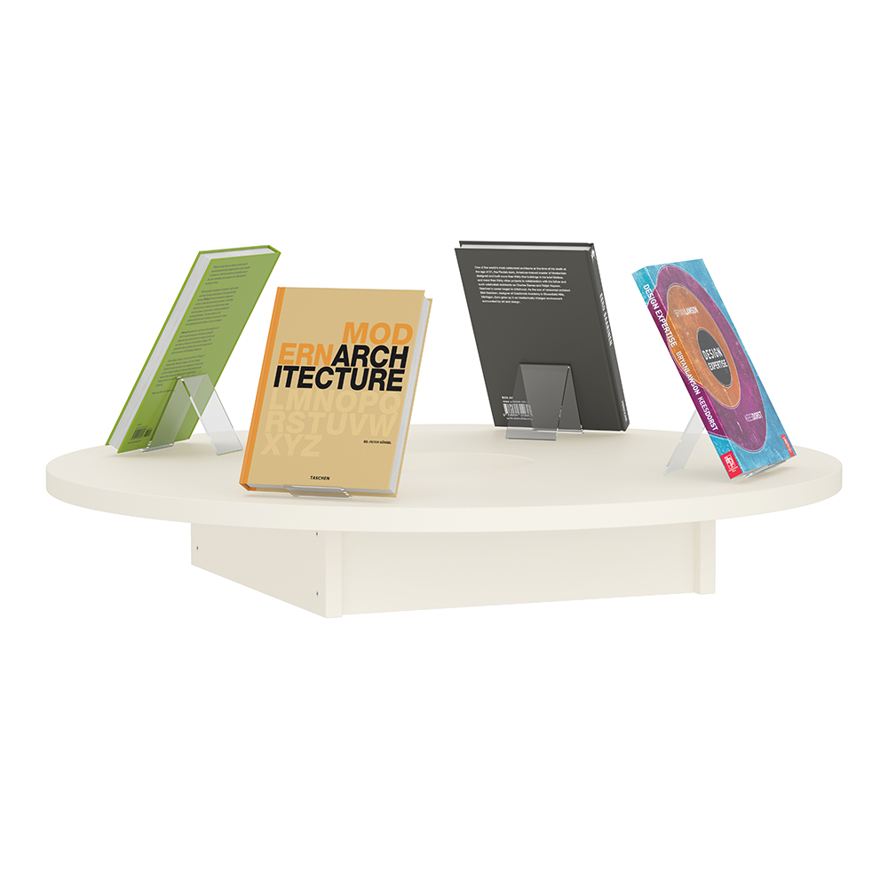 The round top plate is well suited in libraries, where it can be used for book displays, themed presentations, information points, or informal meeting and lounge areas.