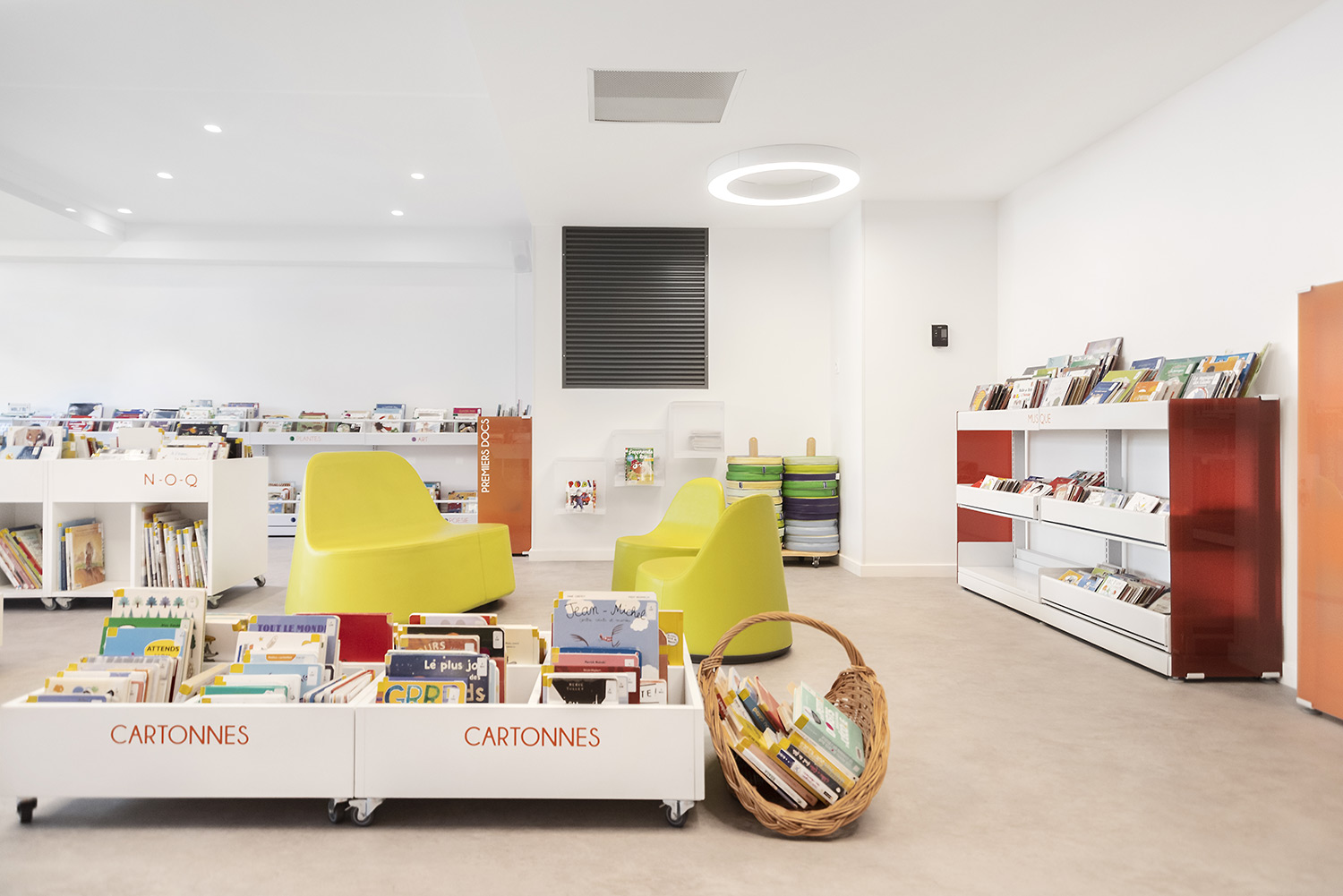 Sara is a functional yet modern browser that presents and stores all types of books and medias in an uncomplicated and visual manner. Depending on the height, the browser can fit both children and adults and be used in all areas of the library.