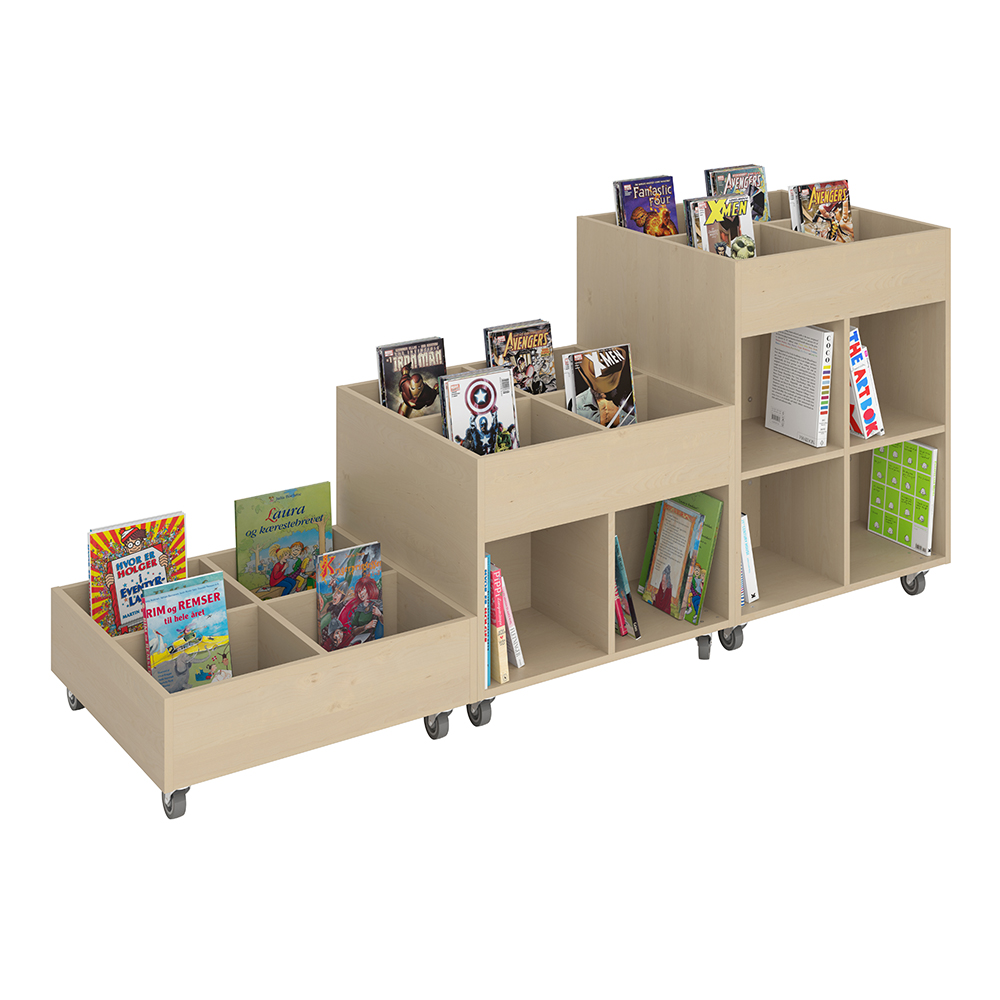 Sara Maxi is a book browser with four display compartments at the top and eight storage compartments underneath. Ideal for both children and adults.