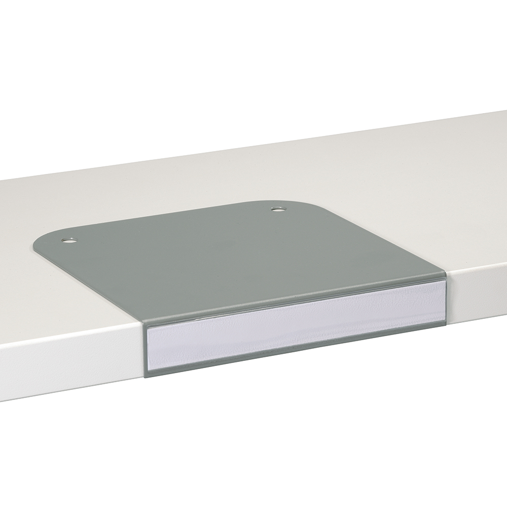 Steel sign with clear anti-reflective plastic label holder and white label.