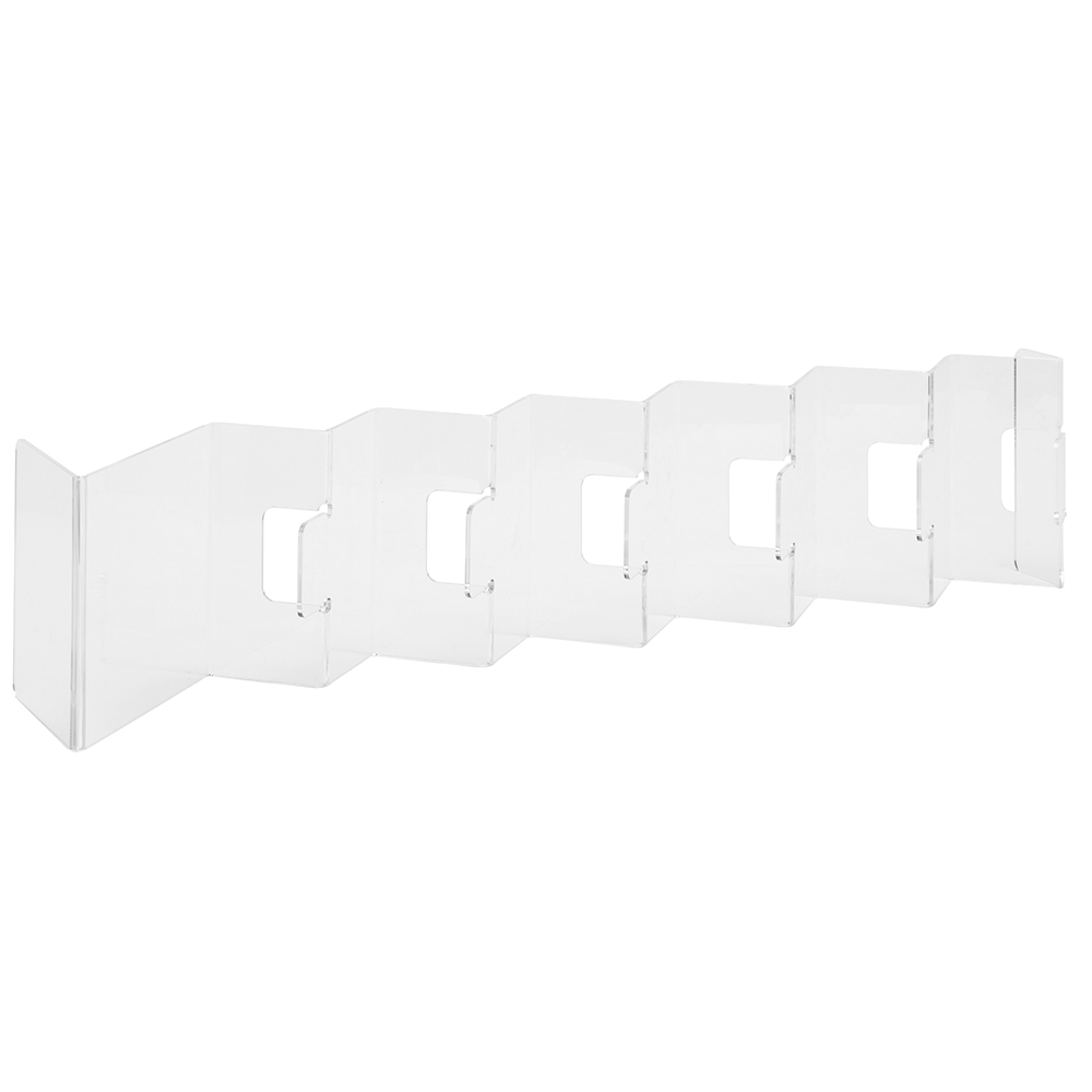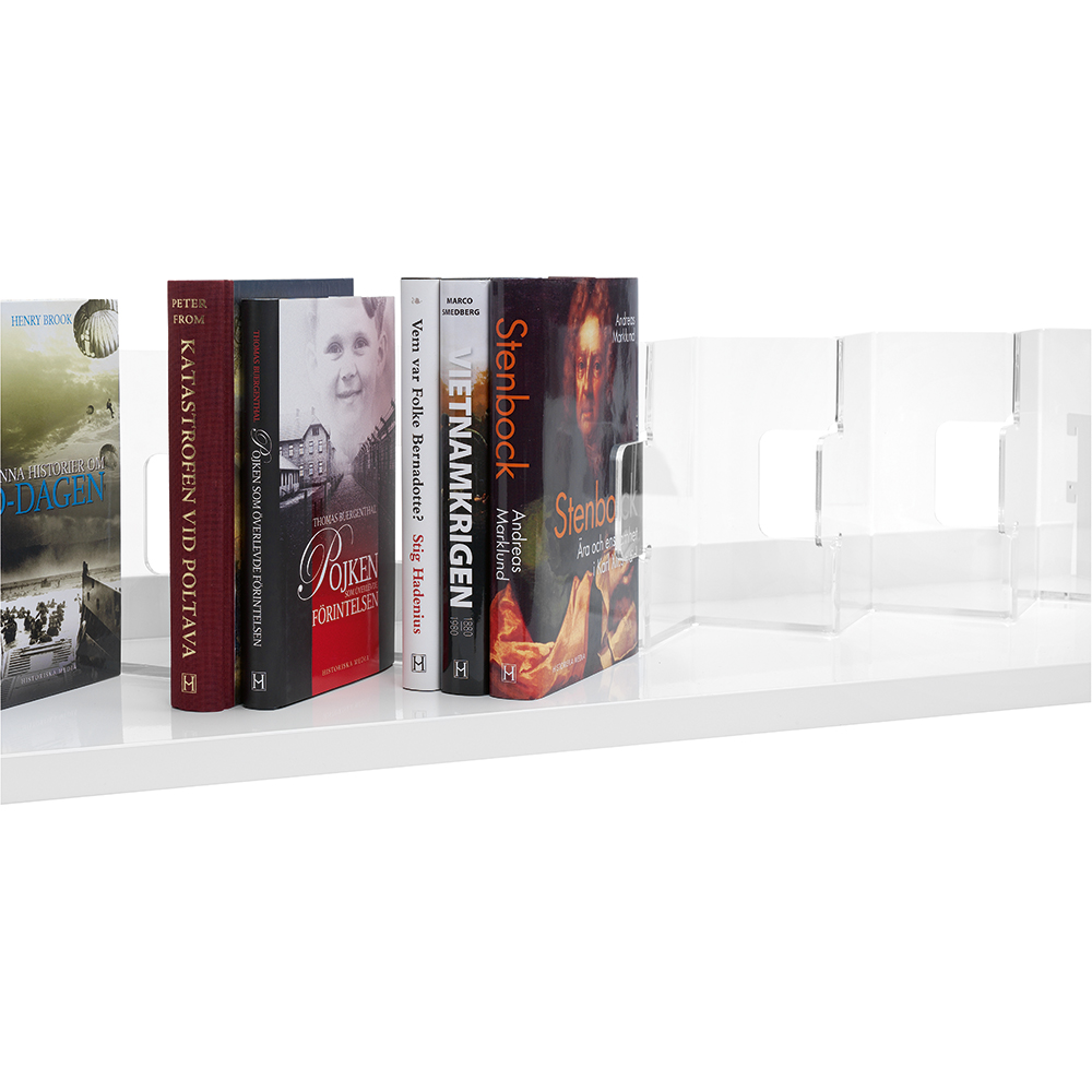 Clever stand with 6 compartments in sturdy, transparent acrylic for face-forward display of books and other media.