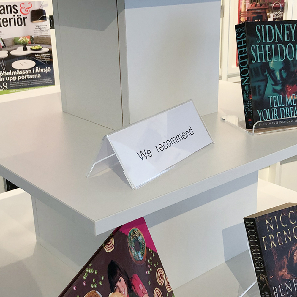 Ideal as information and name tags for counters, tables, podiums and shelves.