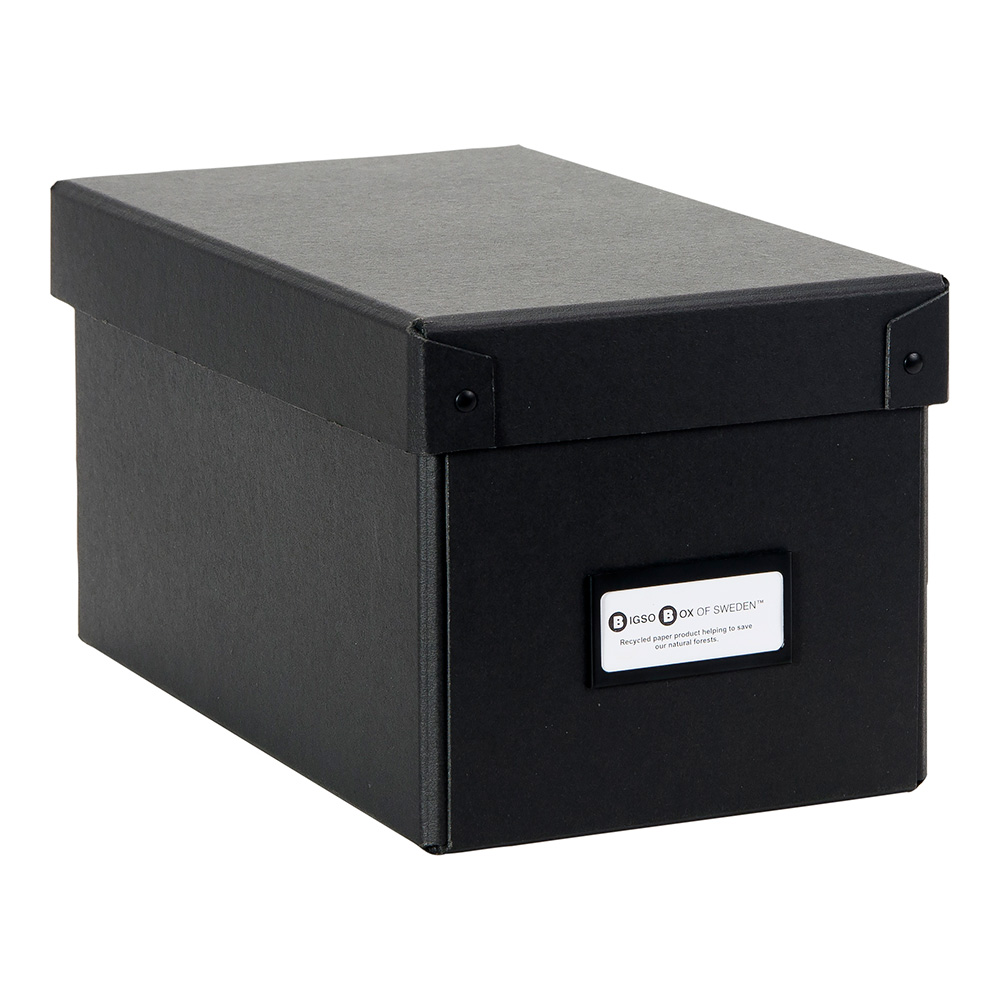 Practical and stylish archival and storage box with lid and label holder in recycled fibreboard.