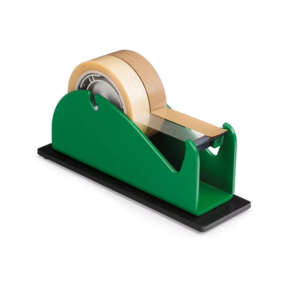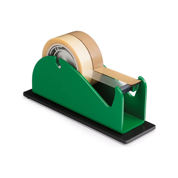This dispenser cuts all types of tape even reinforced tape. It has a non-slip bottom which prevents it from sliding.