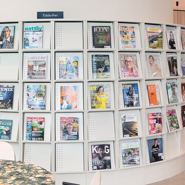 Current magazines and periodicals are stored in a compartment behind the flap (lift and insert). The displayed magazine is kept in place by a transparent sheet over the flap. Easy to replace.
