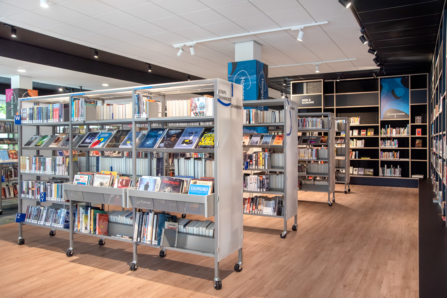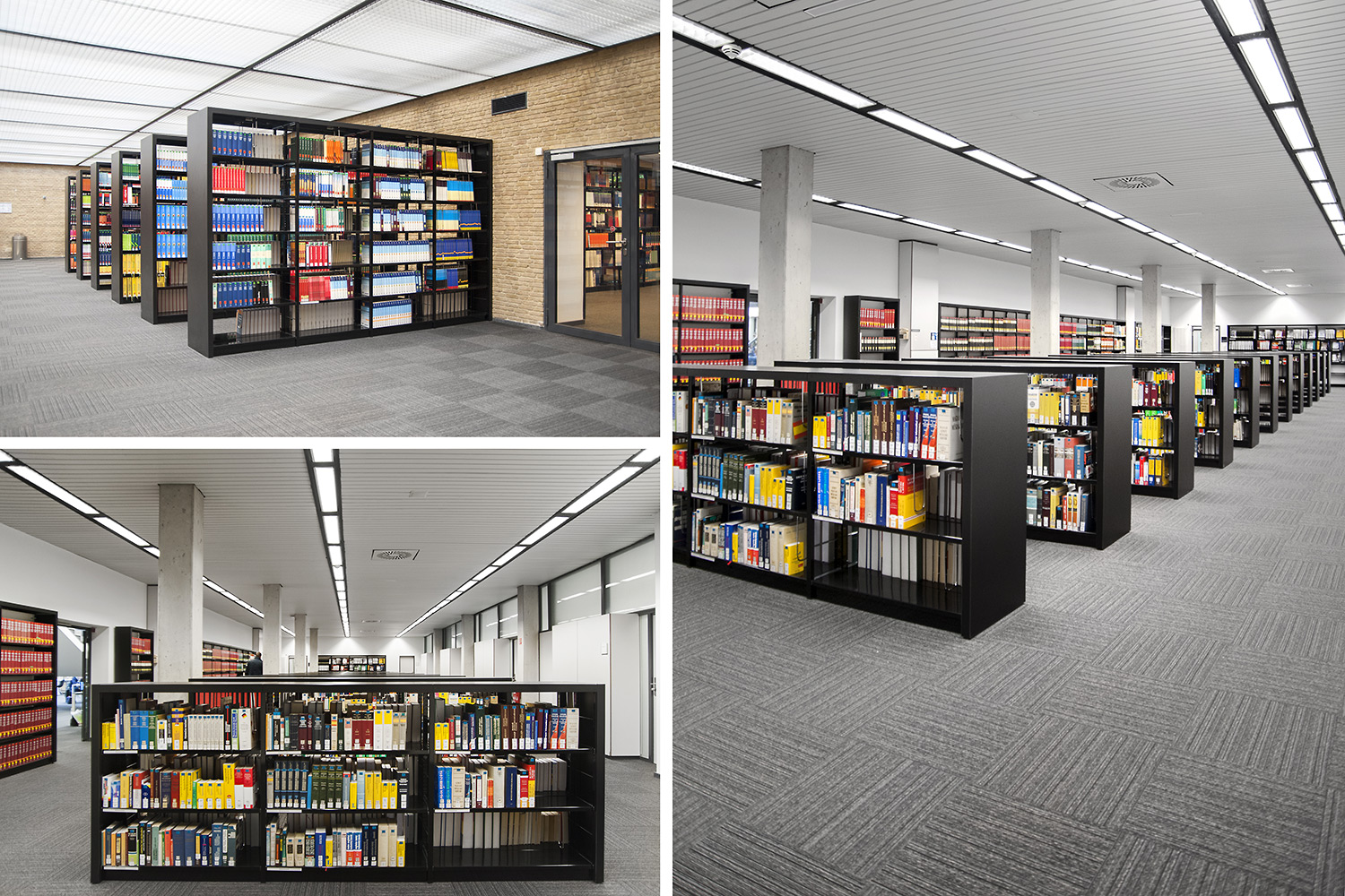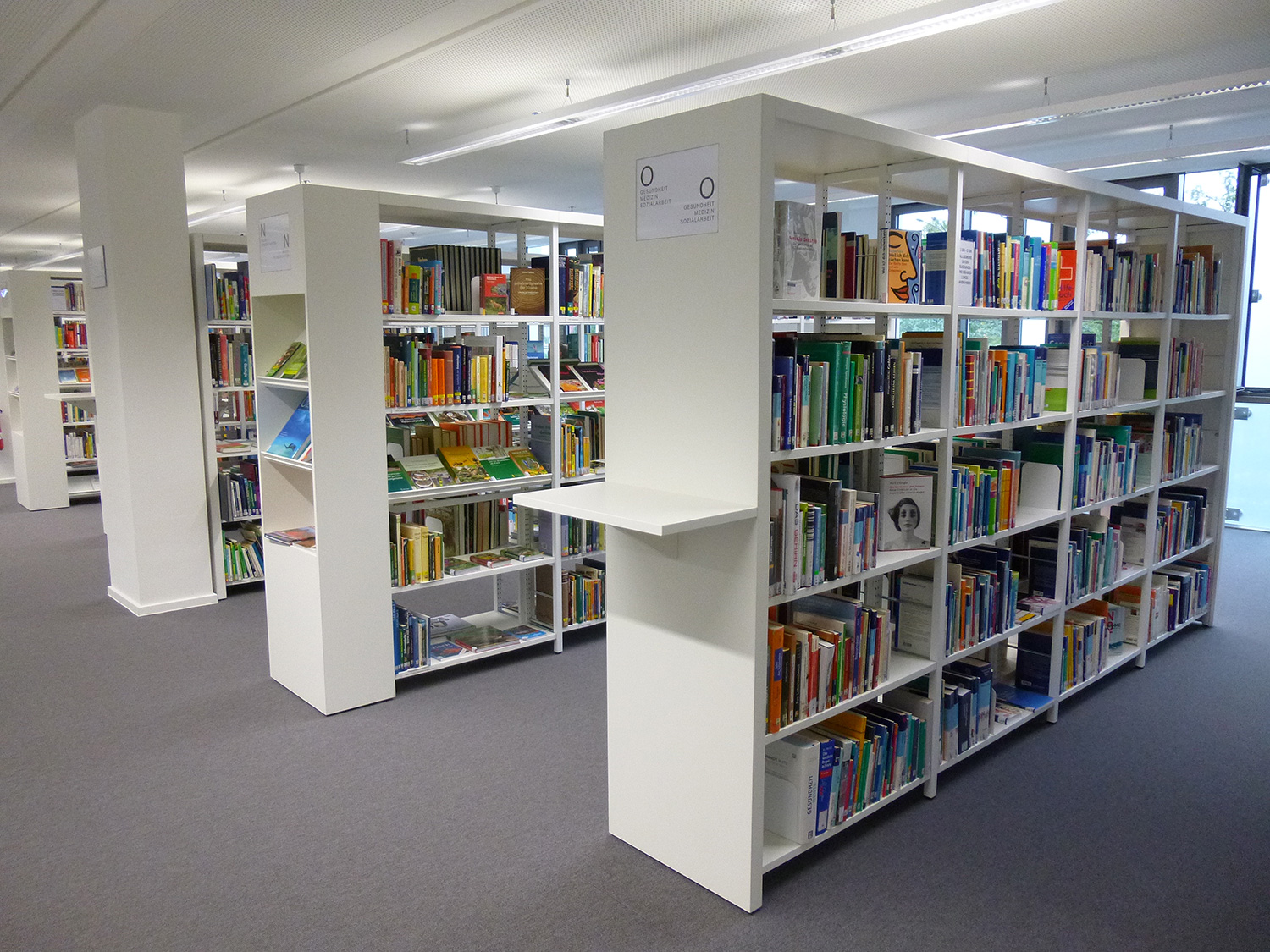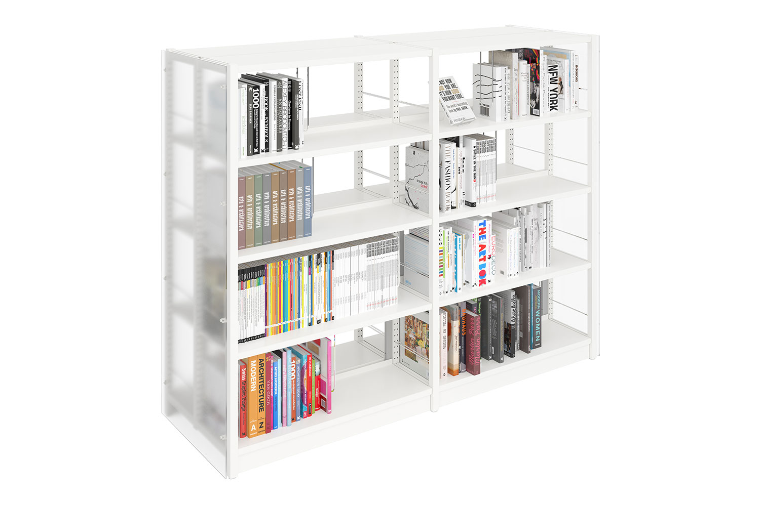 The sturdy shelving system with 30 x 30 mm perforated square tubing is ideally suited for use in high volume libraries as well as in public and school libraries. The design of the shelving systems with its 25 mm grid module allows for easy assembly and adjustment without use of specific tools. The bays are pre-fitted with a multifunctional C profile to allow for easy insertion of top and bottom shelf.