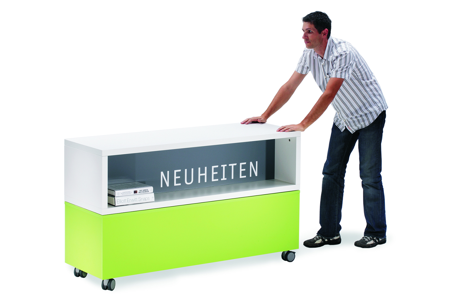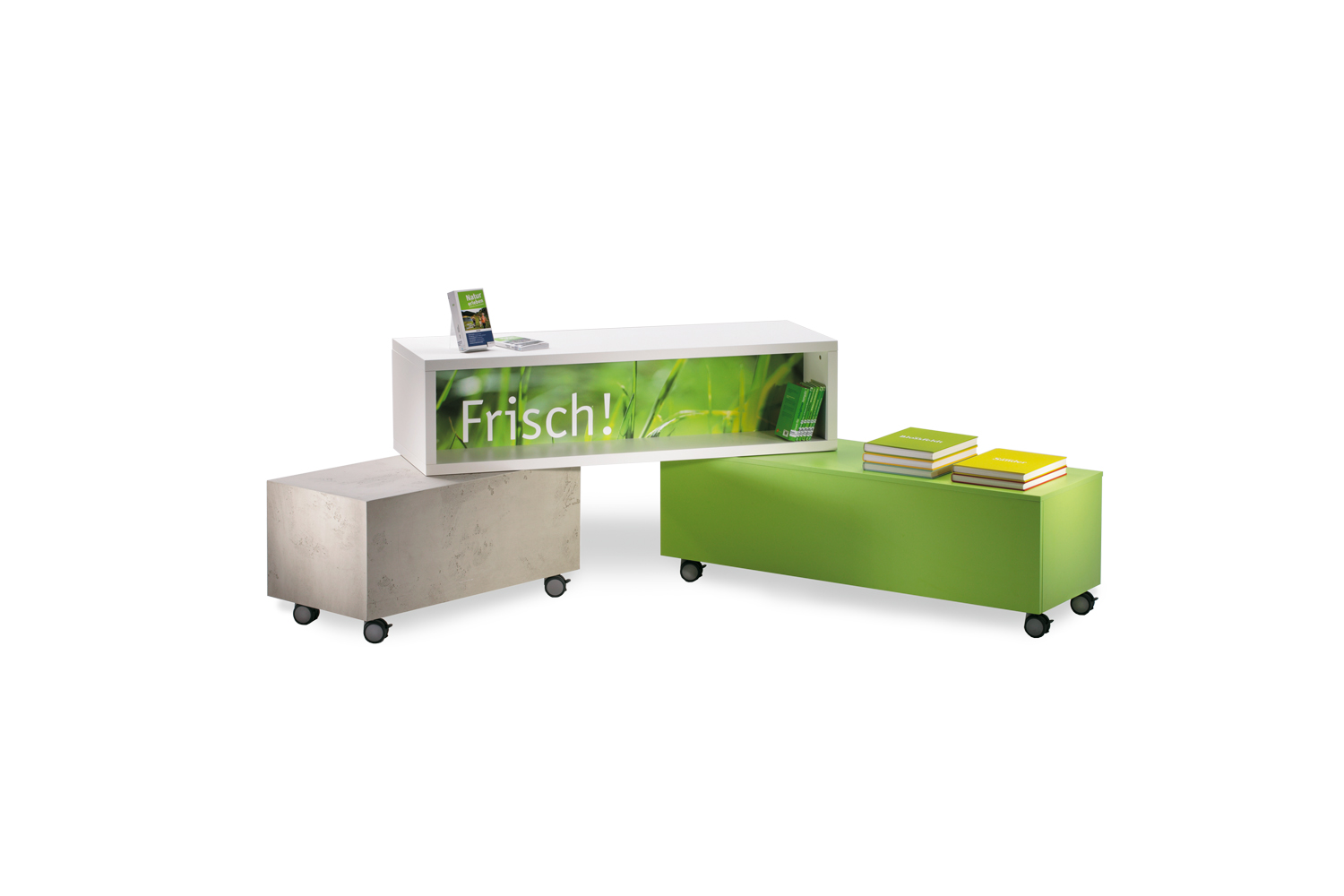 A three-piece, mobile system that combines through swivel joints and a stacked frame, giving multiple options for display and usage. The inside and front partitions can be ordered in contrasting colours and graphics and lettering can also be applied to really accentuate this piece of furniture.