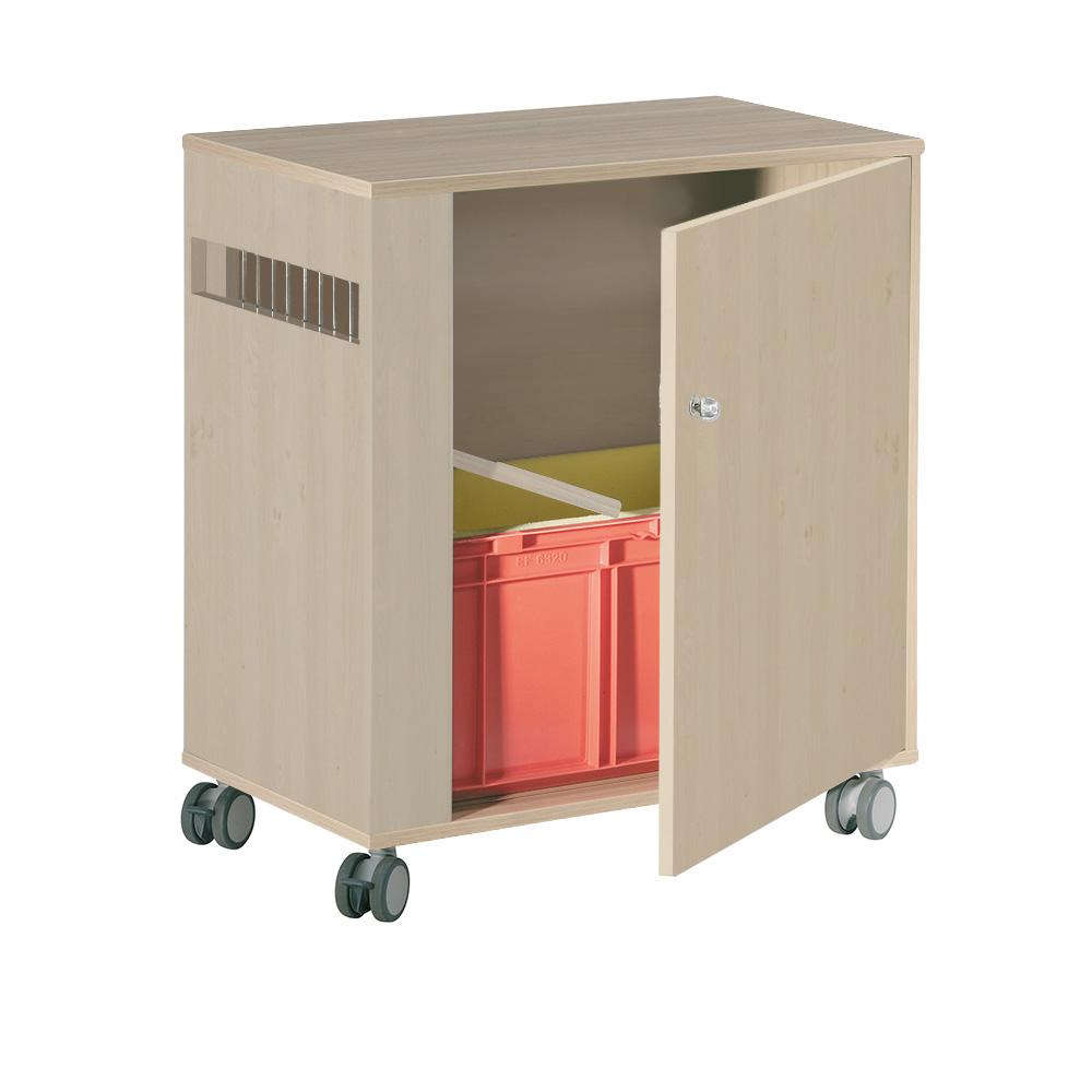 Mobile book return cabinet with a lockable side, for easy access to returned books.